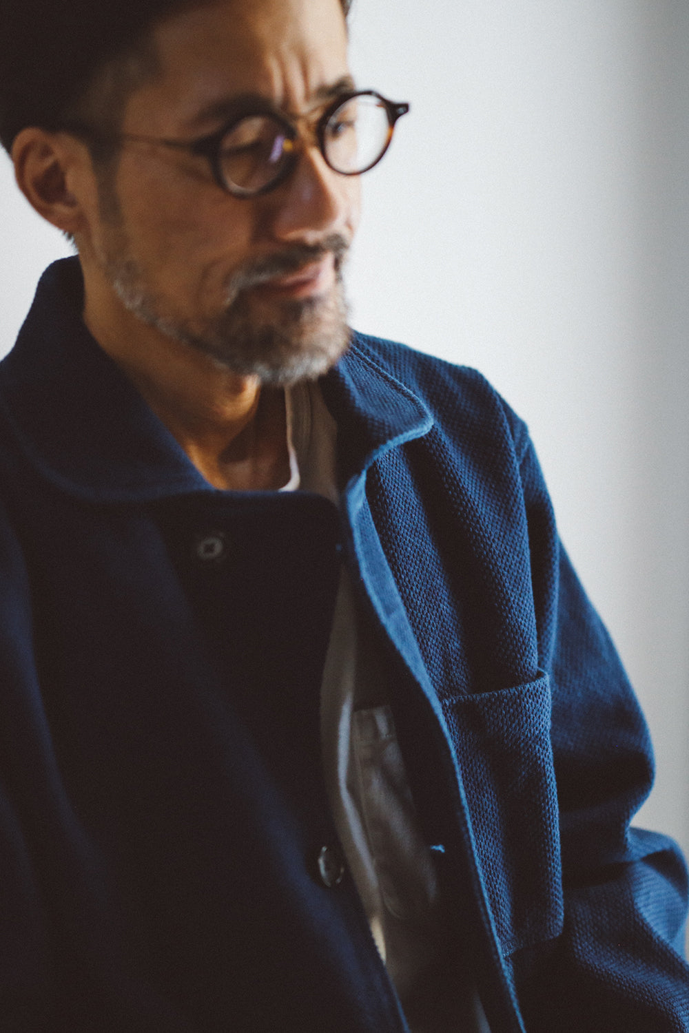 インディゴで染め上げた鮮やかな藍色。経年とともに風合いが増していき、着用するたびに愛着の深まる一枚となります。