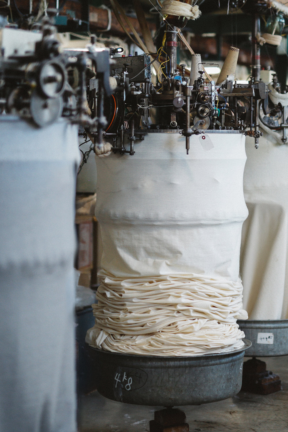 和歌山県「吊り編み」。旧式織機で1時間に1メートル、ゆっくりと丁寧に編み上げられる希少価値の高い生地を採用しています。