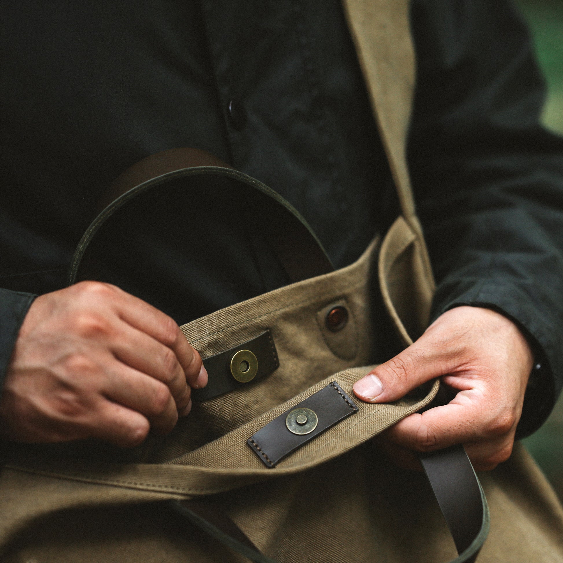 このバッグで採用した「経年変化」するマテリアルは、天然染めの帆布だけに留まらず、パーツ類にも採用しています。ハンドルに採用している革は、「牛の本革」。それに、生地が切れないように補強のためつけているリベットは、「銅」を採用しています。