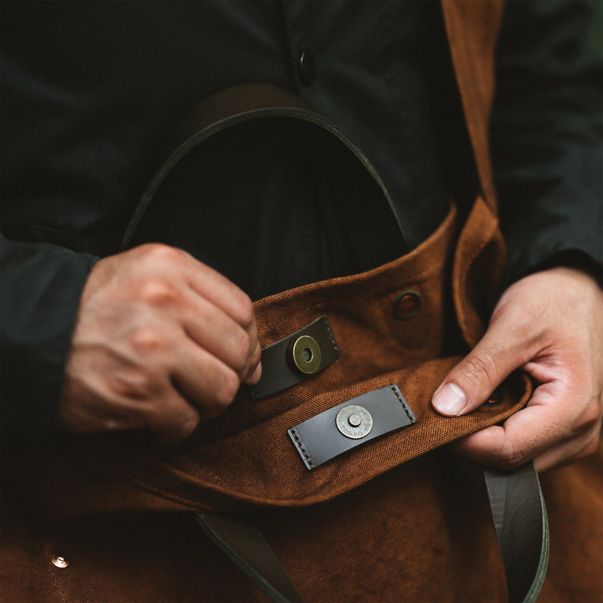 このバッグで採用した「経年変化」するマテリアルは、天然染めの帆布だけに留まらず、パーツ類にも採用しています。ハンドルに採用している革は、「牛の本革」。それに、生地が切れないように補強のためつけているリベットは、「銅」を採用しています。