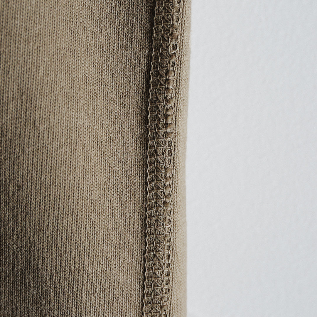 編む際にある程度、密度を詰めて生地を編み上げることで編み目がきれいに揃い、見た目がきれいな生地に仕上がります。またテンションをかけ過ぎないことで、糸と糸の間に空気が含まれ、ふっくらと柔らかな風合いになります。この「見た目のきれいさ」と「柔らかな肌触り、風合い」の両立は「アズマ編み機」で編まれた生地だからこその魅力といえます。