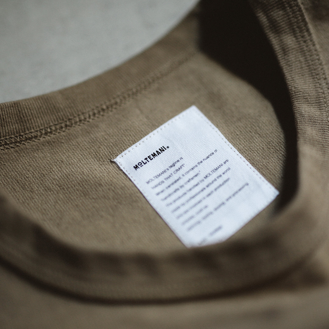 首まわりのネック部分には強度を高めるため、「バインダーネック仕様」を採用。リブ生地でボディ生地を挟み込む様に縫製することで、伸びやへたれる原因を軽減します。