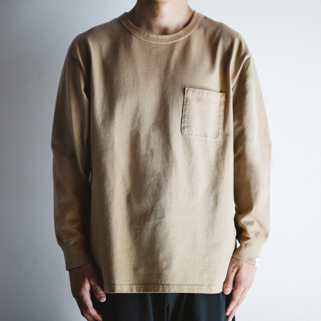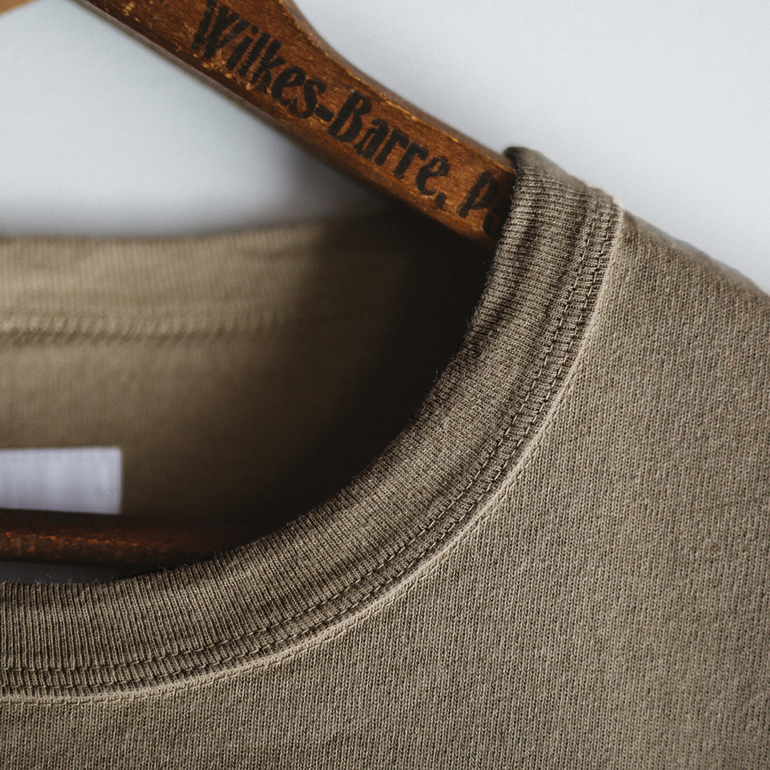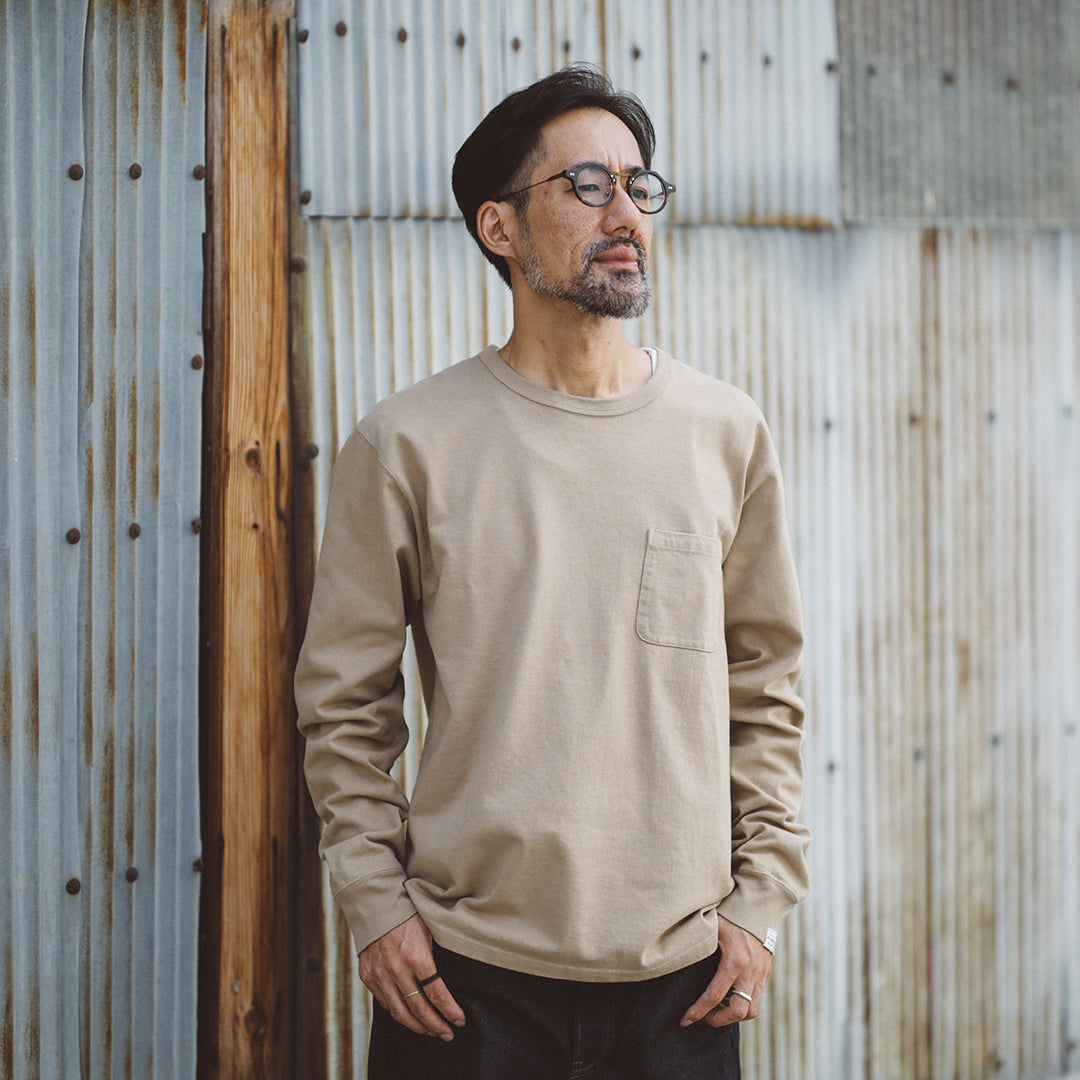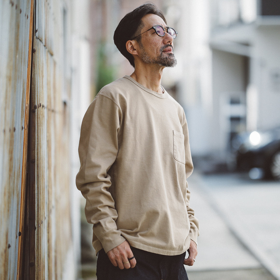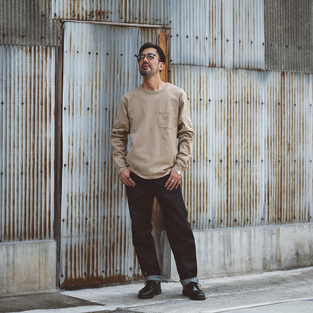 「Wakayama Azuma knit Long Sleeve」の染色の舞台となったのは、”京都府”。着込むほどに風合いが増していき、愛着の持てるTシャツに仕上げたいという思いがありました。それを実現させるためのポイントとなるのは、生地もさることながら染色も重要です。様々な染色手法がある中、採用に至ったのは「Garment Dye / 製品染め」。製品が仕上がってから染める方法です。製品になってから染めるということは、縫い目も生地も同じ色に染色されるということ。それにより縫い目が生地に馴染み、先染め製品にはない独特の風合いが生まれます。そして着込むほどに絶妙なアタリや色ムラが生まれ、着用した人の痕跡が反映されパーソナルな一着に仕上がります。それこそが今回「Garment Dye / 製品染め」を採用した目的です。