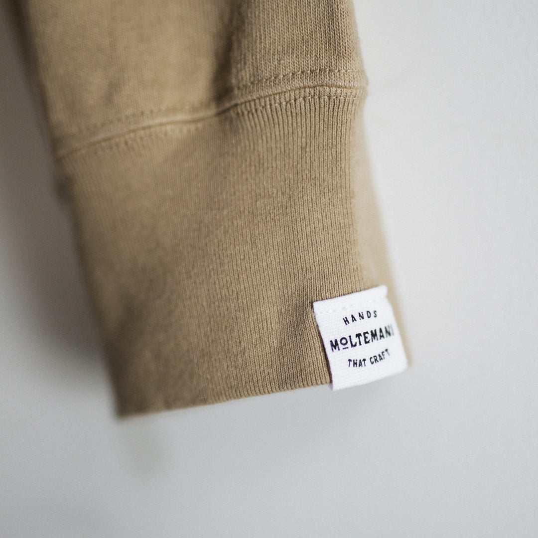 一本の糸から始まるMOLTEMANIのモノづくり。生地の舞台となったのは、日本有数のニット産地・和歌山県。「Wakayama Azuma knit Long Sleeve」の生地が生まれた場所です。生地の依頼をしたニッターさんでは、日本製の「アズマ編み機」という希少性の高い編み機が使われています。低速編み機(シンカー)と高速編み機の中間に位置するこの編み機は、絶妙な風合いの生地に仕上げるために誕生しました。「アズマ編み機」で編まれた生地は「アズマ裏毛」と言われ、膨らみと柔らかな風合いのある生地として知られています。