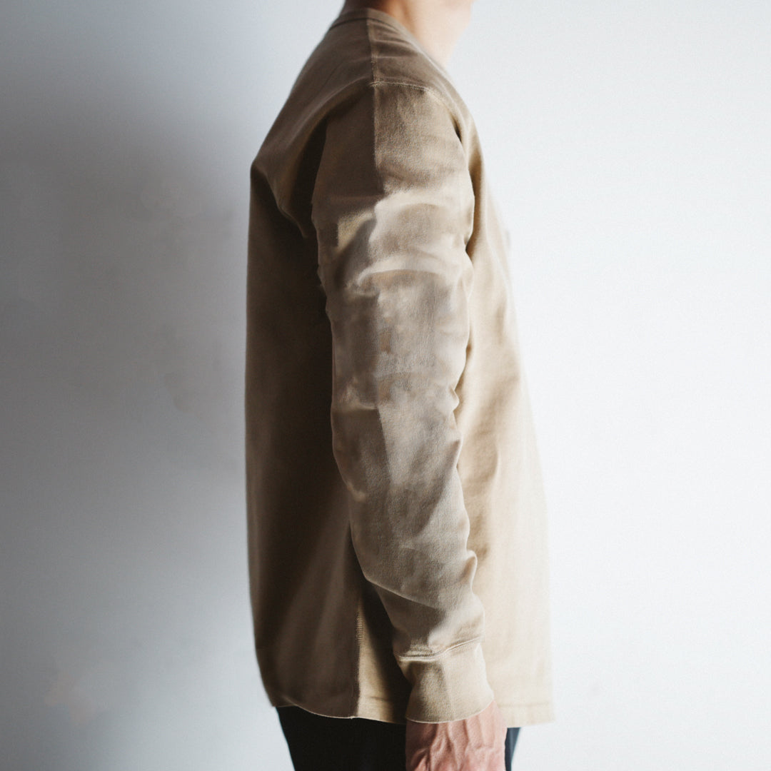 依頼をしたのは、30年染色一筋の職人さん。京都が育んできた高級絹織物「西陣織」を手がけた伝統工芸士の先代から職人としての志を受け継ぎ、高い技術とプライドを持って染色活動に取り組まれています。今回の「Wakayama Azuma knit Long Sleeve」は、和歌山県「アズマ編み機」で糸の密度を詰めて編み上げた、いわゆる”度詰め”生地。大量生産の生地と比較して染まり具合が異なり、通常の工程よりも1.5倍ほどの手間をかけて染め上げられます。そうすることで、染め上げた後に独特の風合いが生まれます。