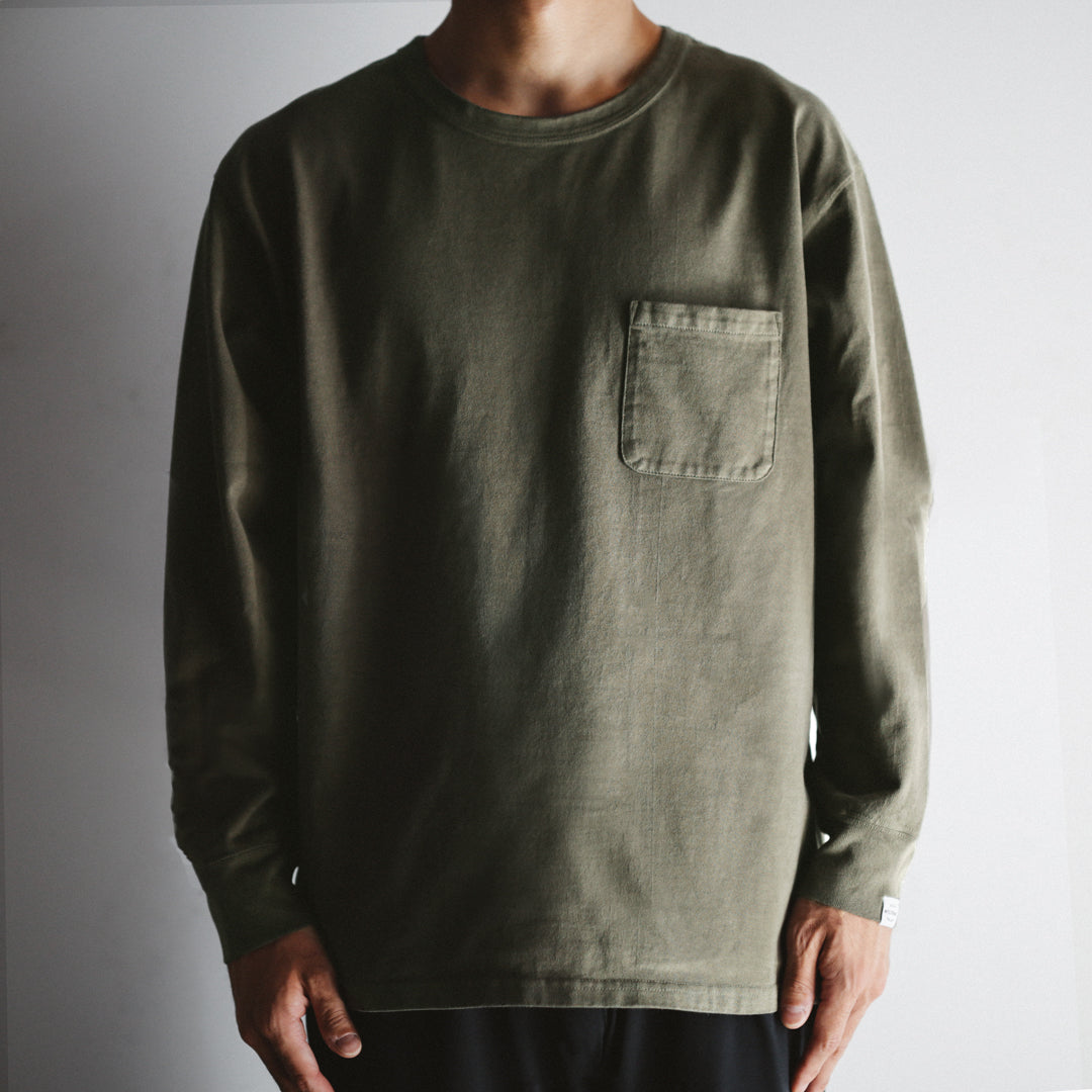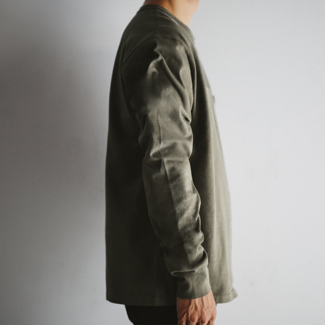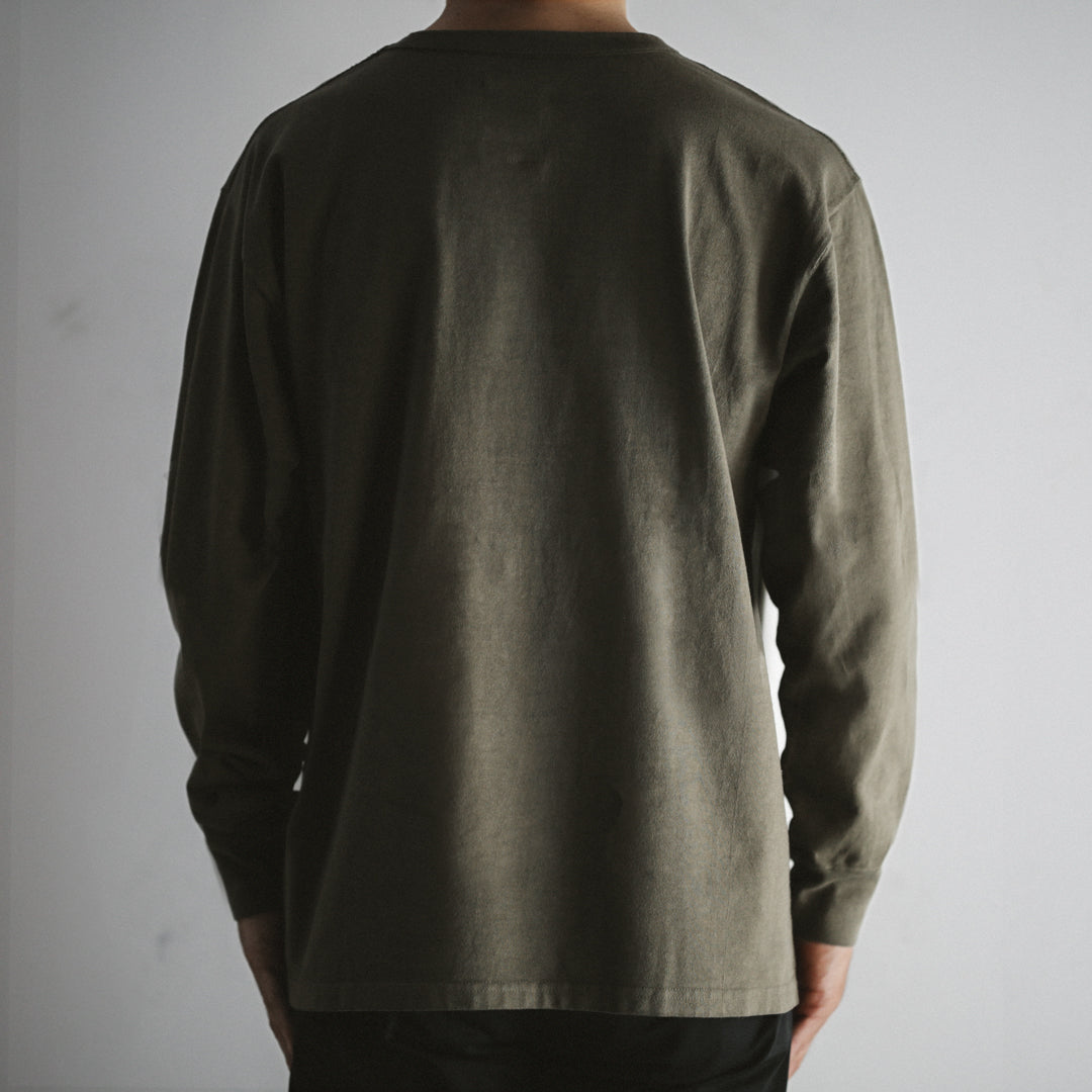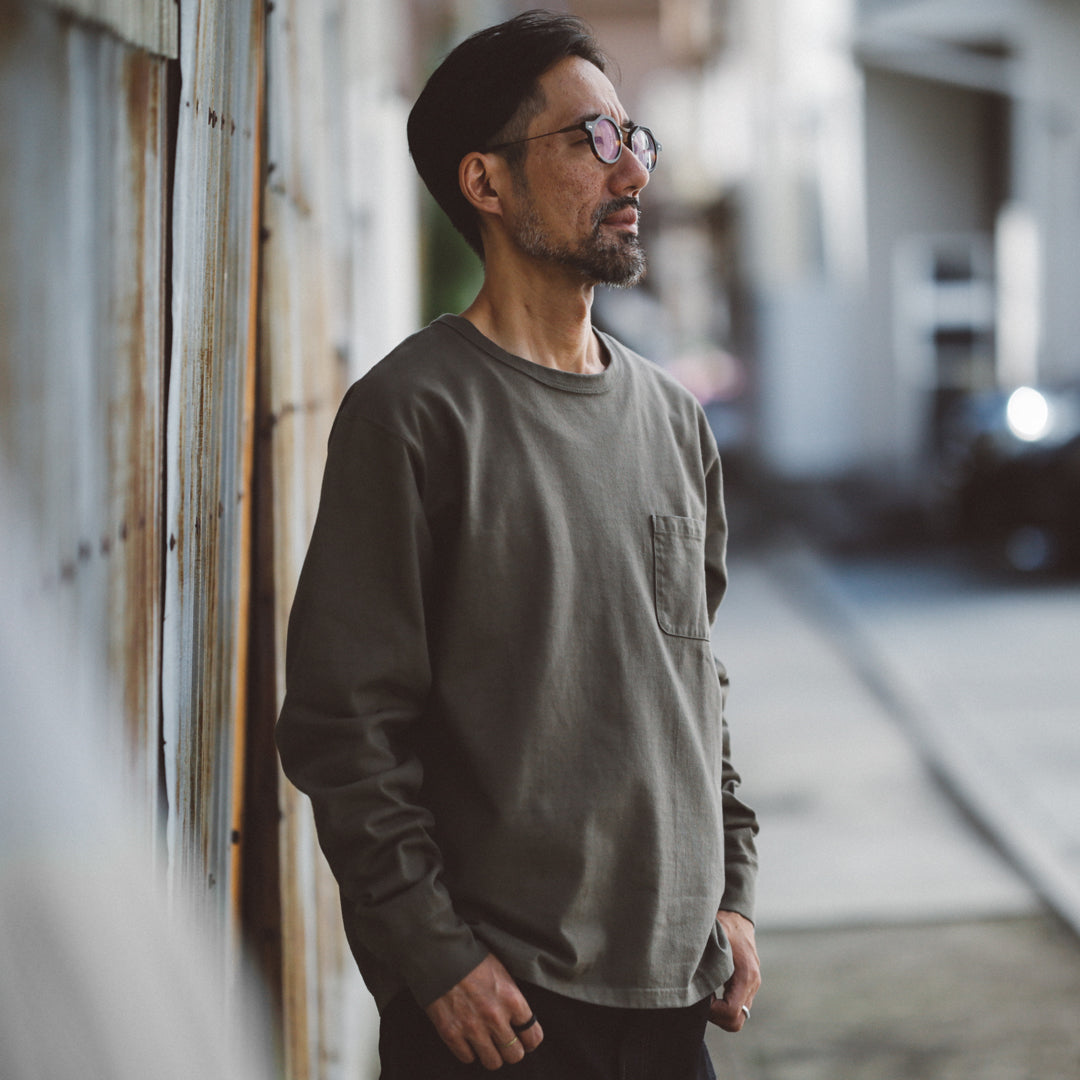 「Wakayama Azuma knit Long Sleeve」の染色の舞台となったのは、”京都府”。着込むほどに風合いが増していき、愛着の持てるTシャツに仕上げたいという思いがありました。それを実現させるためのポイントとなるのは、生地もさることながら染色も重要です。様々な染色手法がある中、採用に至ったのは「Garment Dye / 製品染め」。製品が仕上がってから染める方法です。製品になってから染めるということは、縫い目も生地も同じ色に染色されるということ。それにより縫い目が生地に馴染み、先染め製品にはない独特の風合いが生まれます。そして着込むほどに絶妙なアタリや色ムラが生まれ、着用した人の痕跡が反映されパーソナルな一着に仕上がります。それこそが今回「Garment Dye / 製品染め」を採用した目的です。