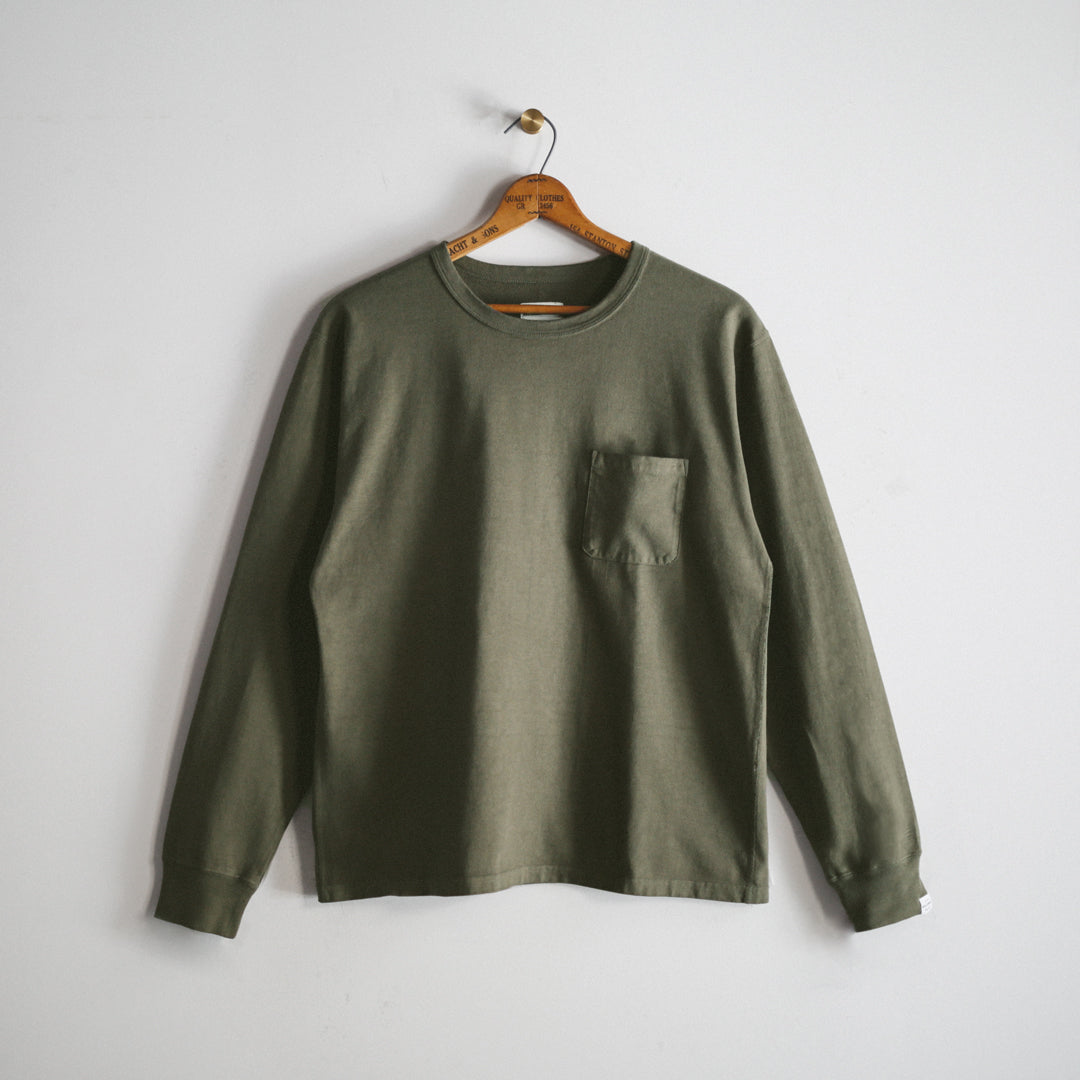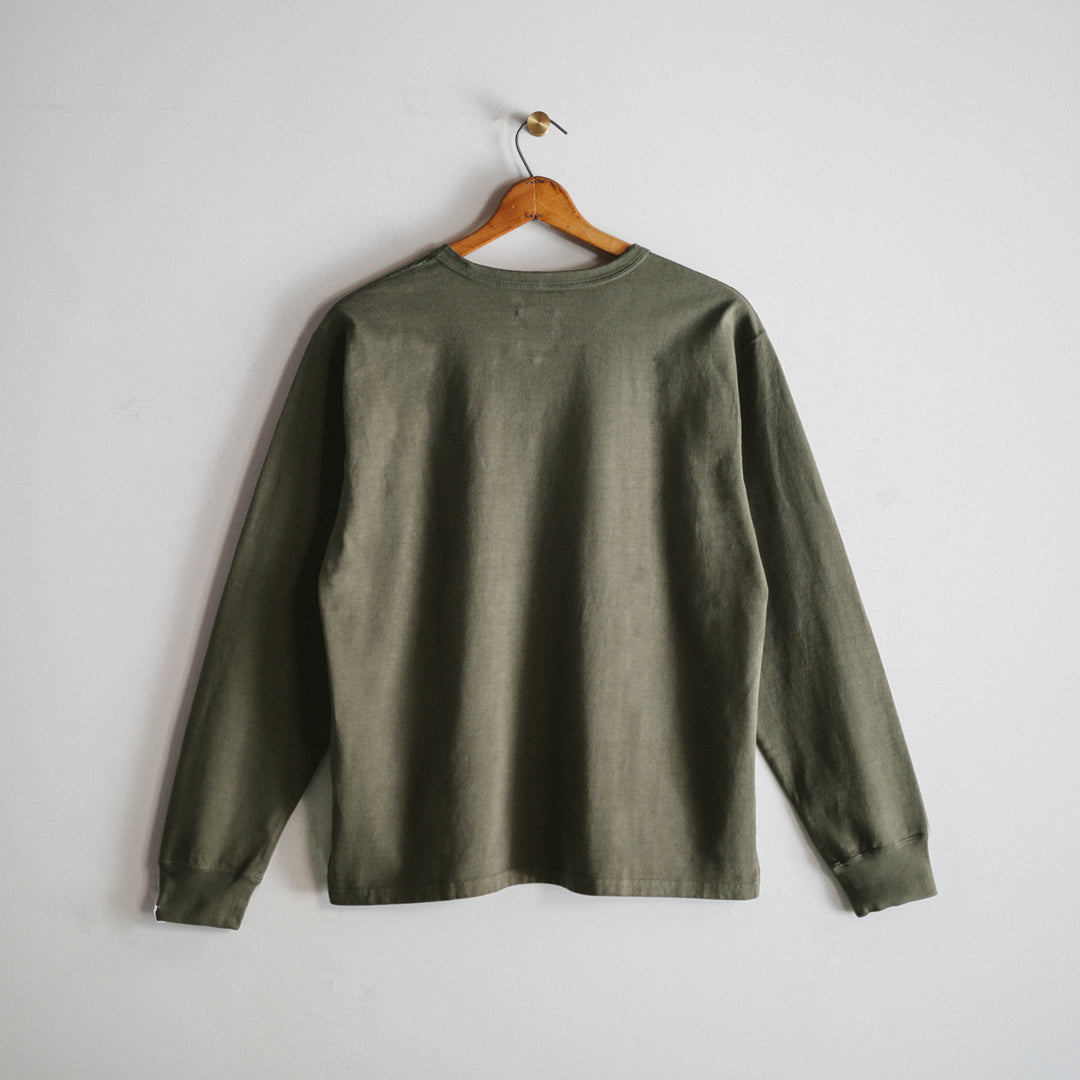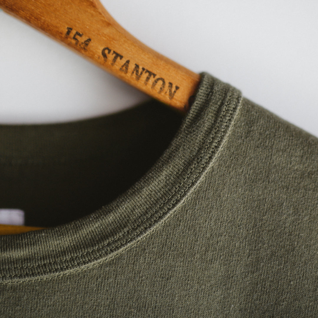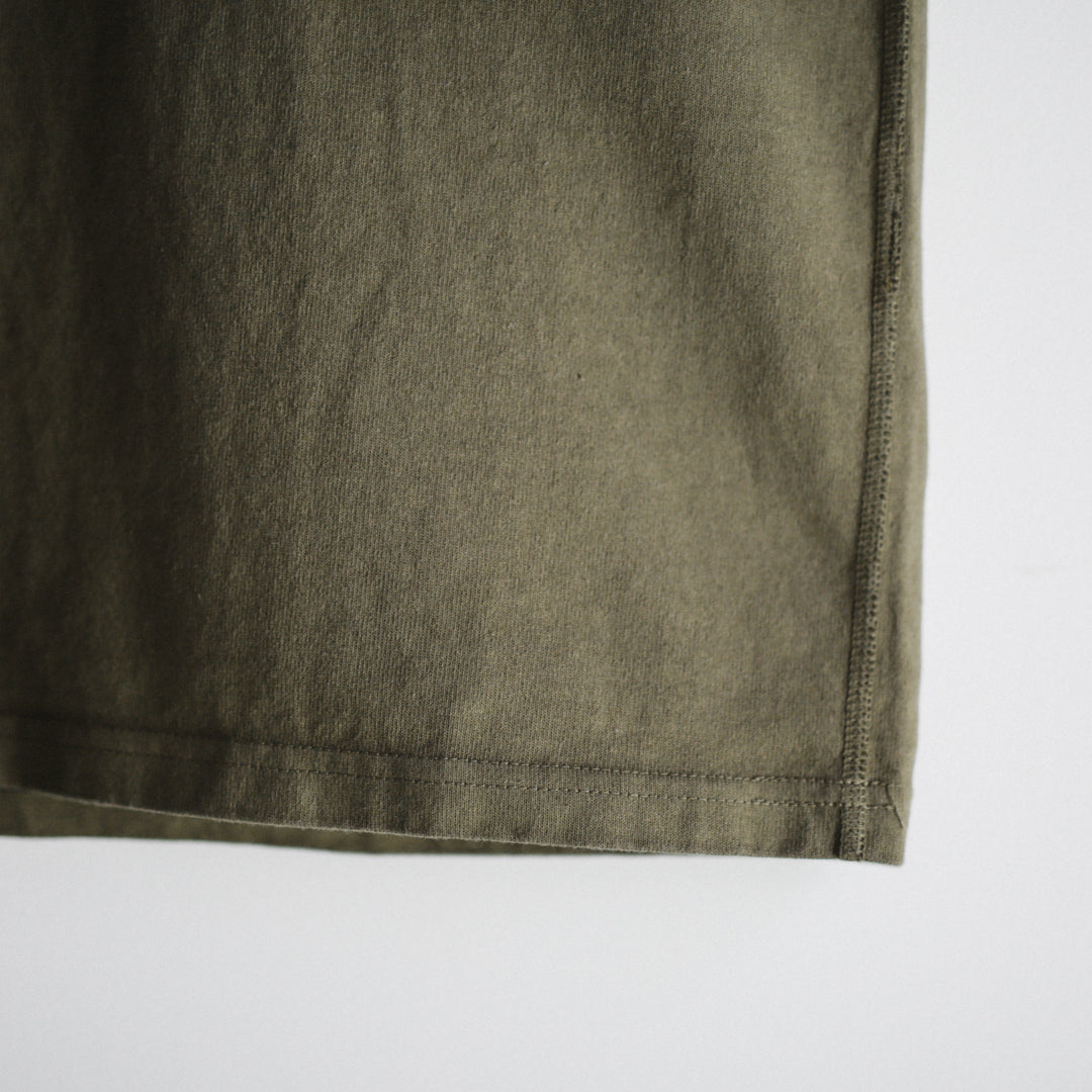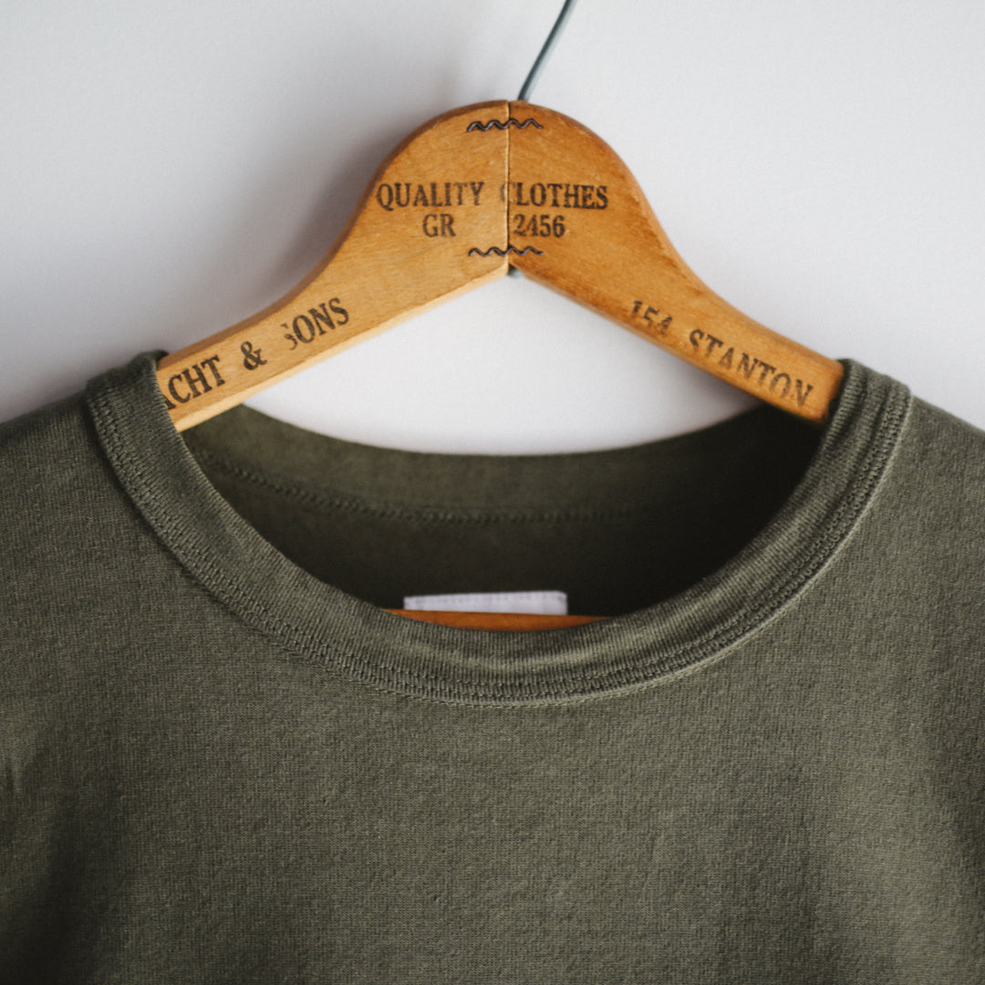 「Wakayama Azuma knit Long Sleeve」の染色の舞台となったのは、”京都府”。着込むほどに風合いが増していき、愛着の持てるTシャツに仕上げたいという思いがありました。それを実現させるためのポイントとなるのは、生地もさることながら染色も重要です。様々な染色手法がある中、採用に至ったのは「Garment Dye / 製品染め」。製品が仕上がってから染める方法です。製品になってから染めるということは、縫い目も生地も同じ色に染色されるということ。それにより縫い目が生地に馴染み、先染め製品にはない独特の風合いが生まれます。そして着込むほどに絶妙なアタリや色ムラが生まれ、着用した人の痕跡が反映されパーソナルな一着に仕上がります。それこそが今回「Garment Dye / 製品染め」を採用した目的です。