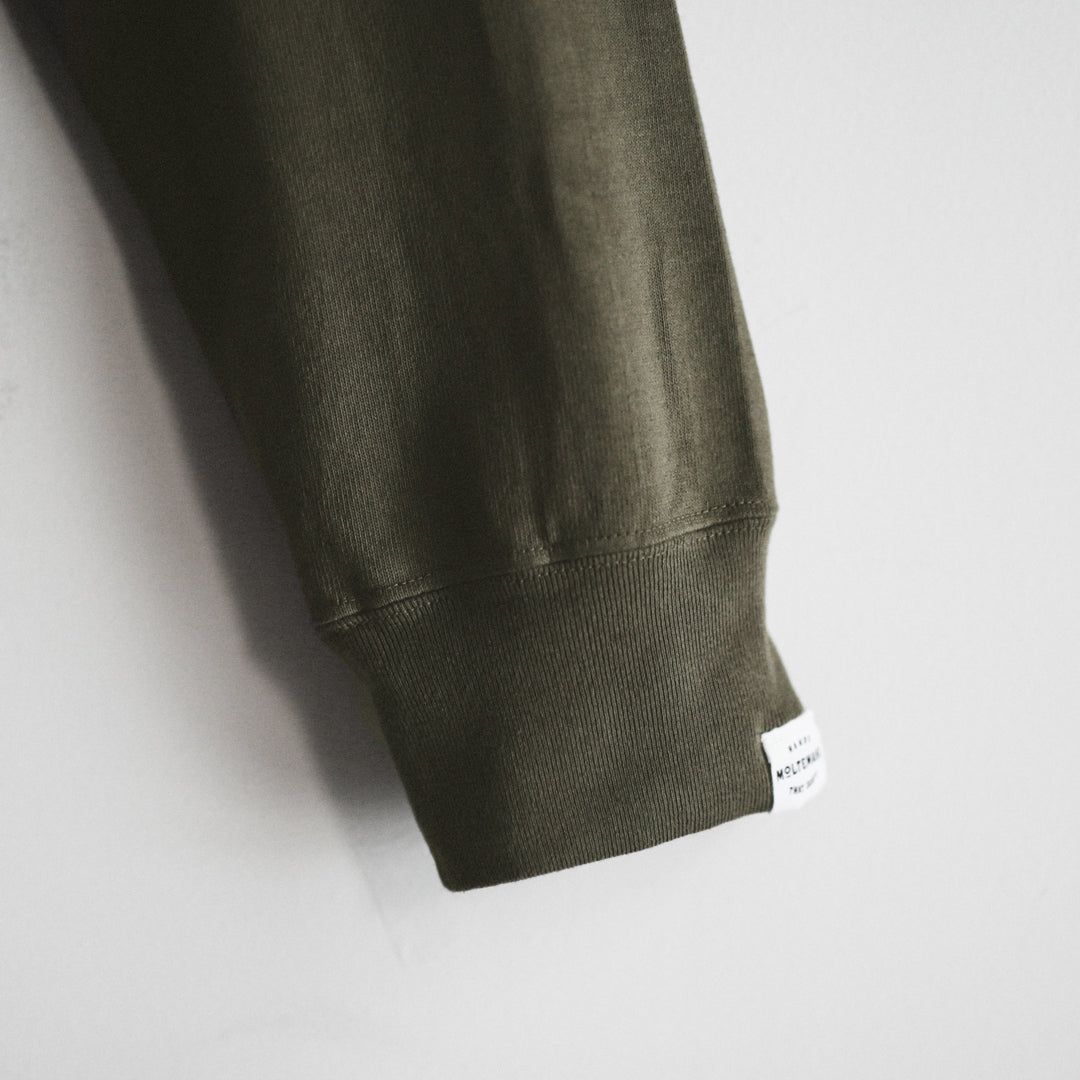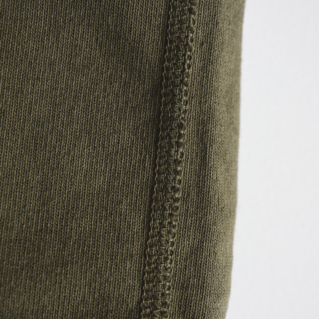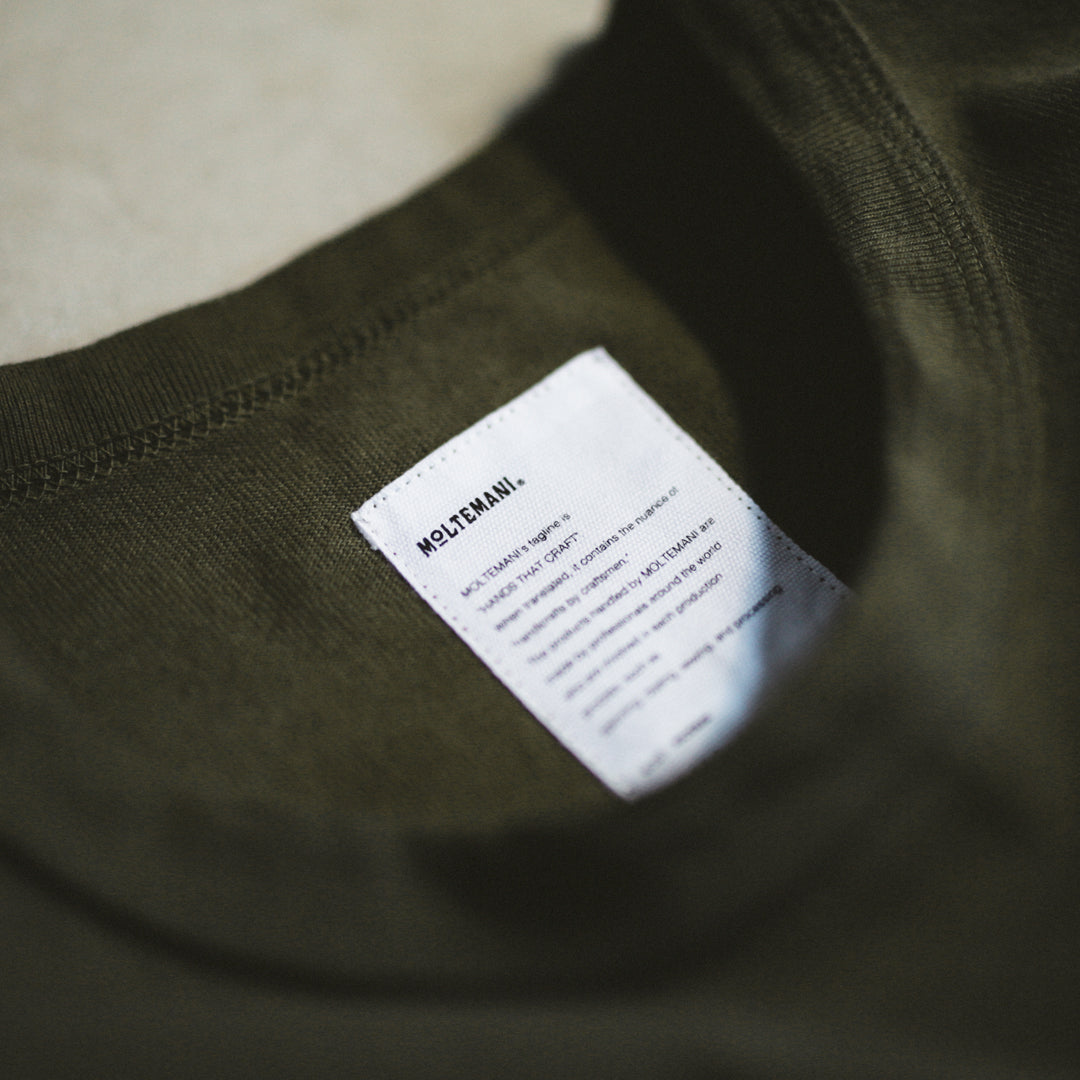 首まわりのネック部分には強度を高めるため、「バインダーネック仕様」を採用。リブ生地でボディ生地を挟み込む様に縫製することで、伸びやへたれる原因を軽減します。