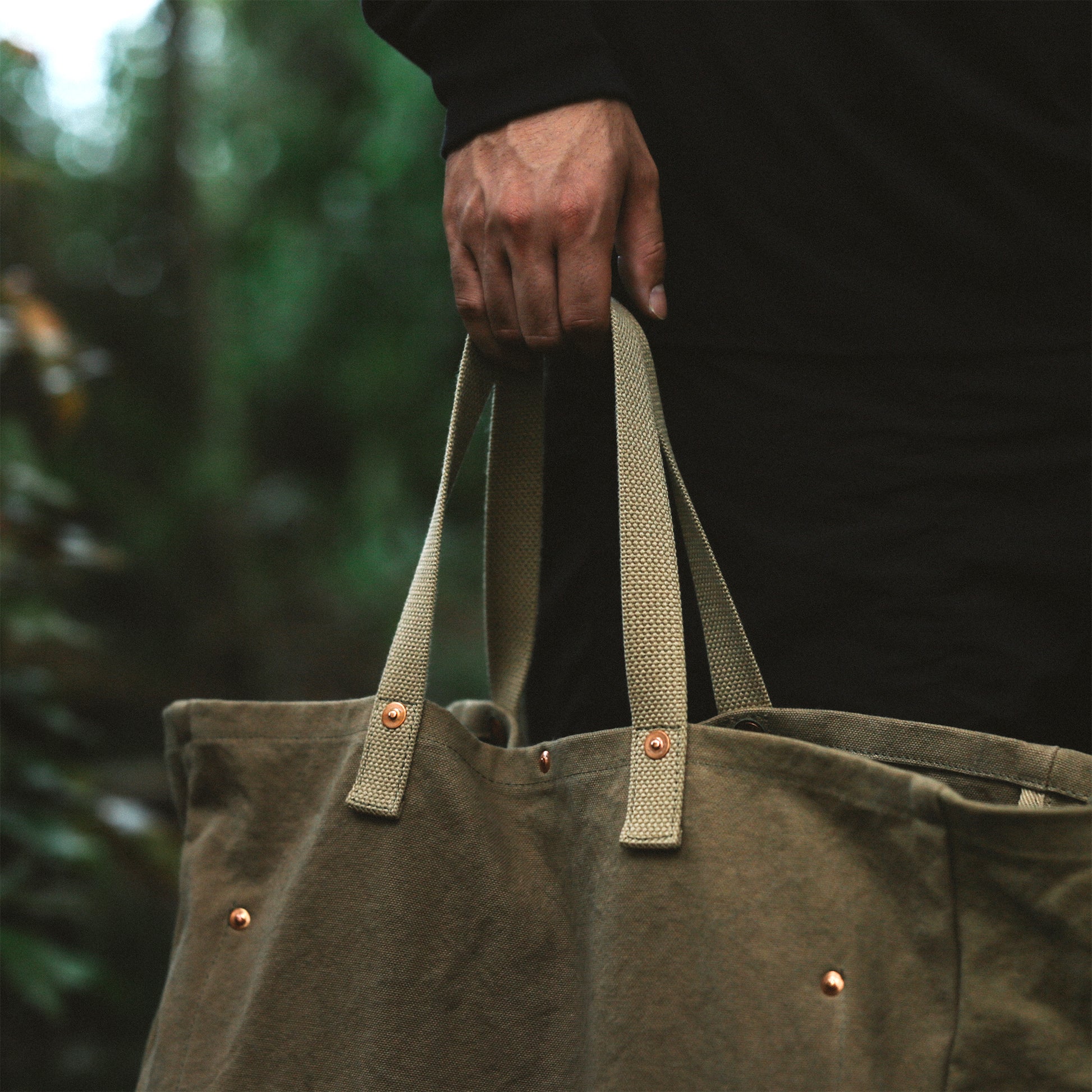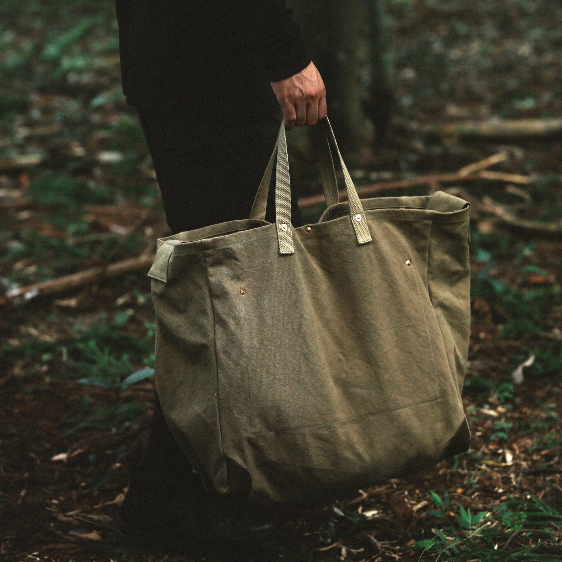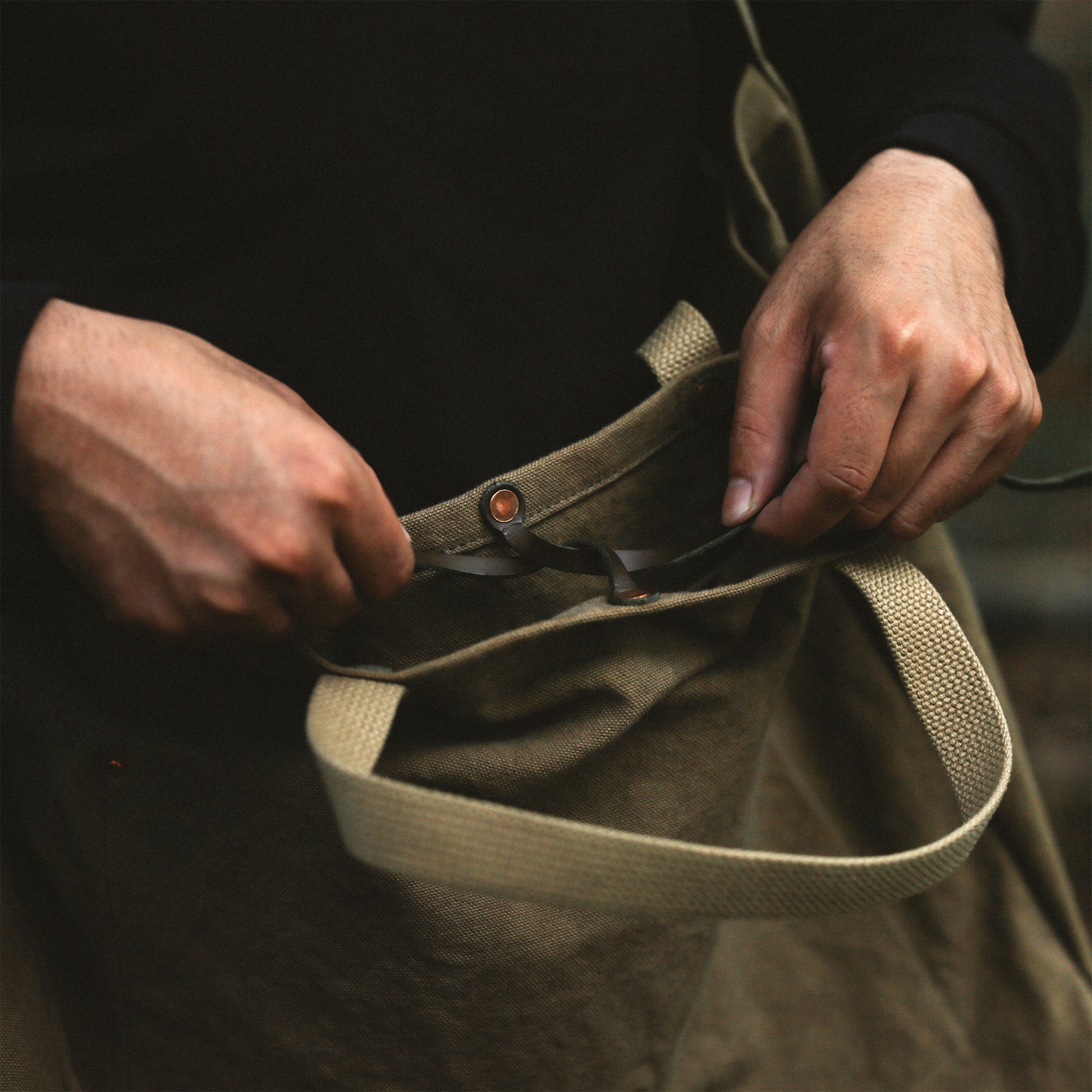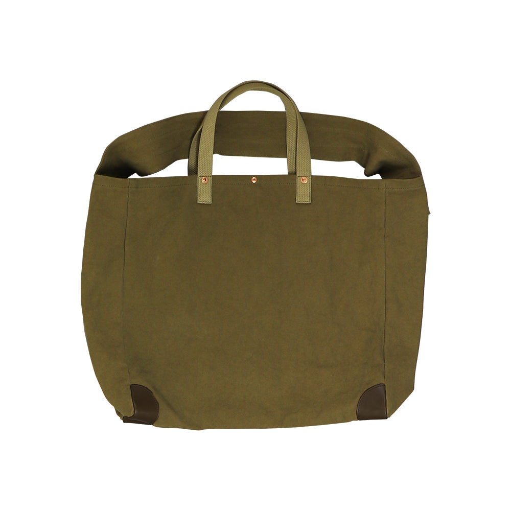 このバッグで採用した「経年変化」するマテリアルは、天然染めの帆布だけに留まらず、パーツ類にも採用しています。ボディの角に採用している革は、「牛の本革」。それに、生地が切れないように補強のためつけているリベットは、「銅」を採用しています。