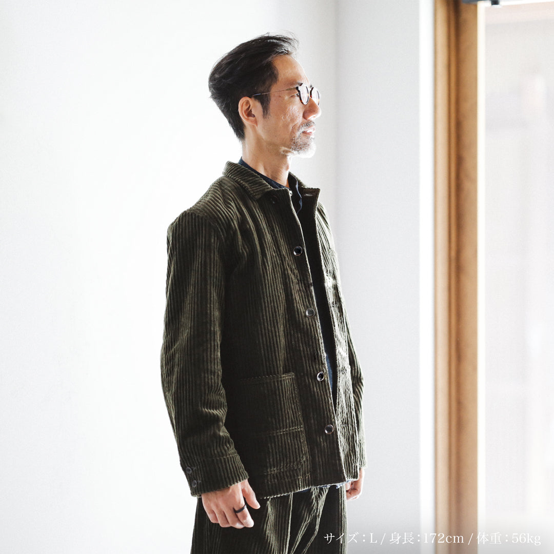 生地にはコットン100%を使用した、太畝の「3.5W コーデュロイ」を採用。一般的な10〜12Wとは一線を画す極太の畝で、その一本一本が際立つことでアイテムとしての確かな存在感を持たせています。