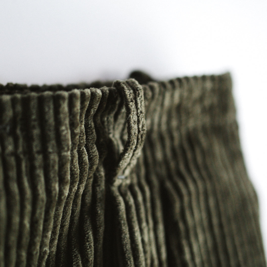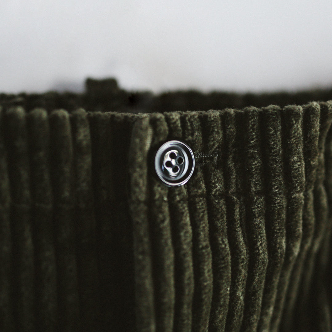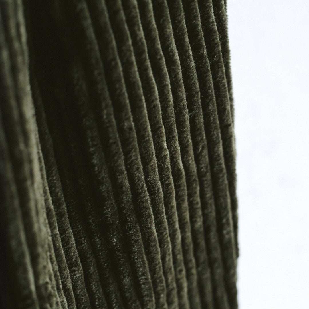 力強さを持ちながら光沢をまとい、角度によって表情を変える多面性もコーデュロイの魅力のひとつ。落ち着いた色合いと掛け合わせることで、奥行きのある表情と品の良さをあわせ持つアイテムに仕上げています。