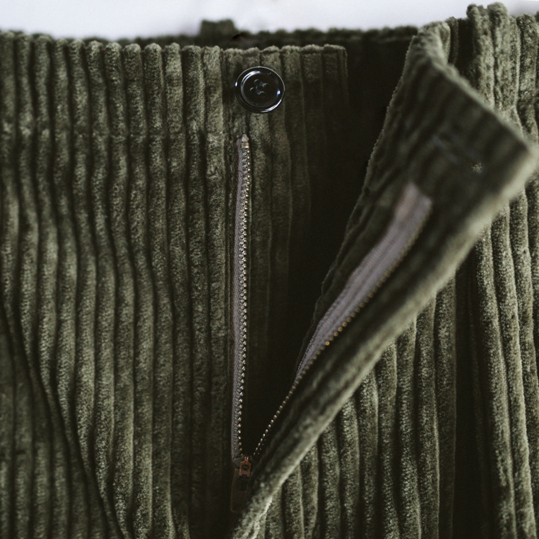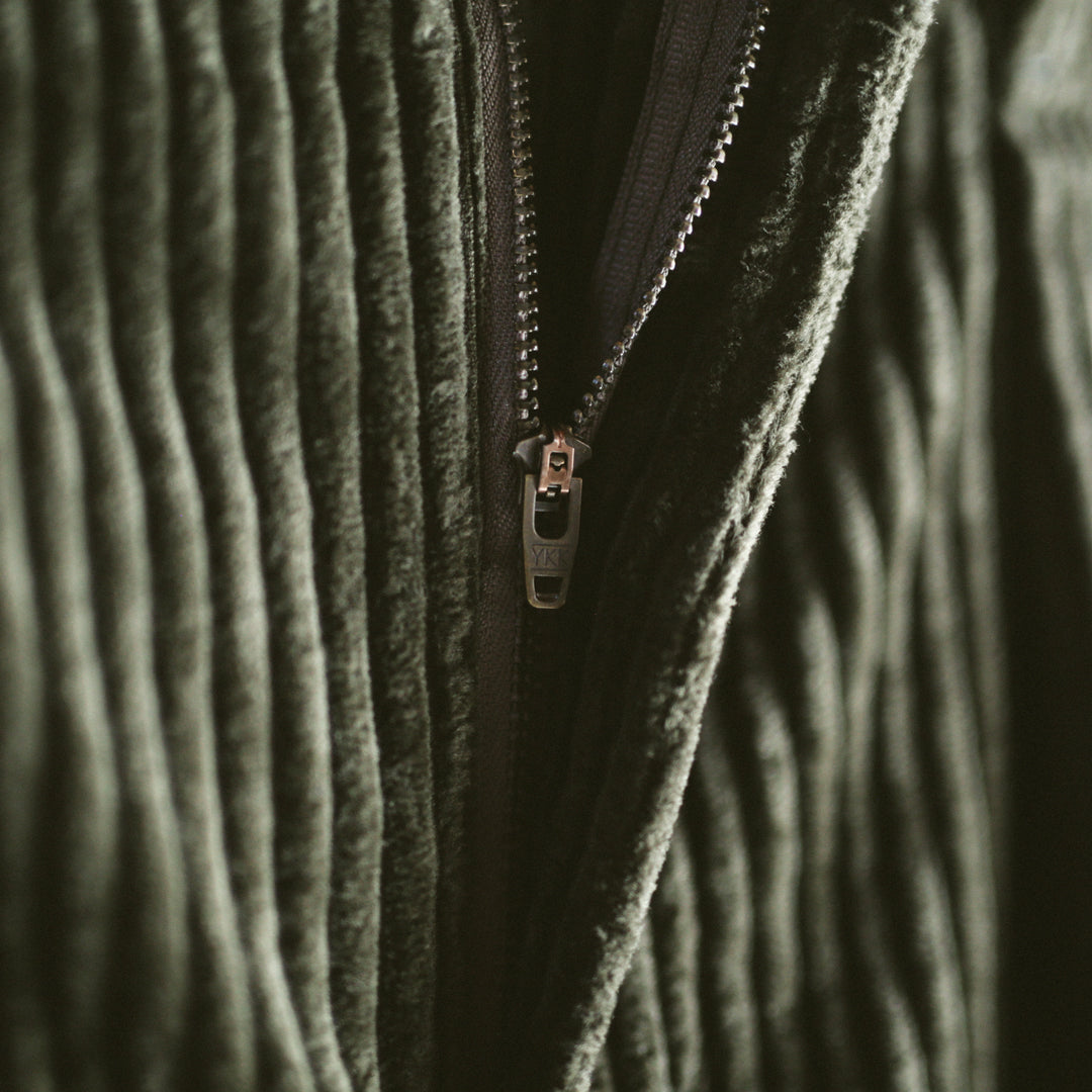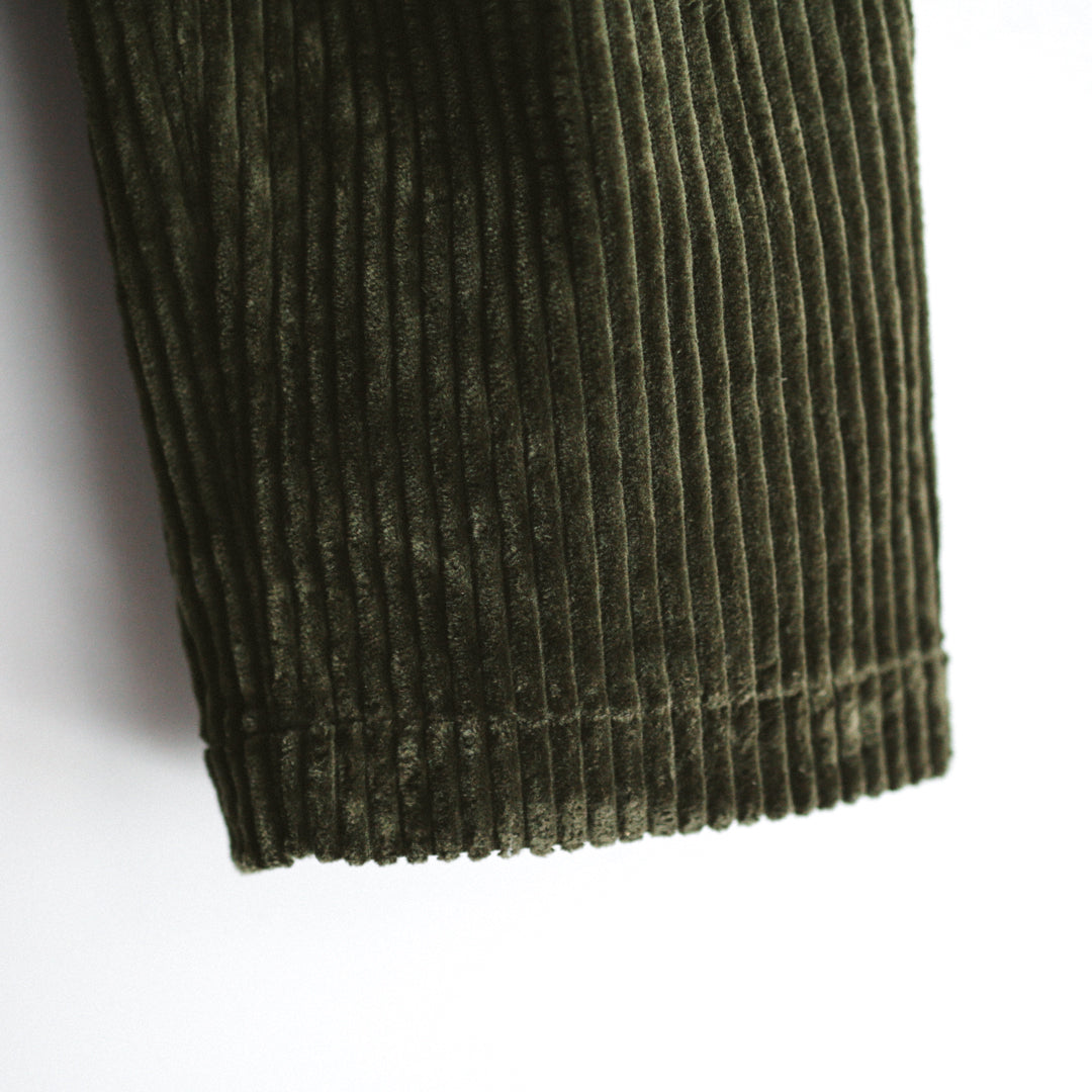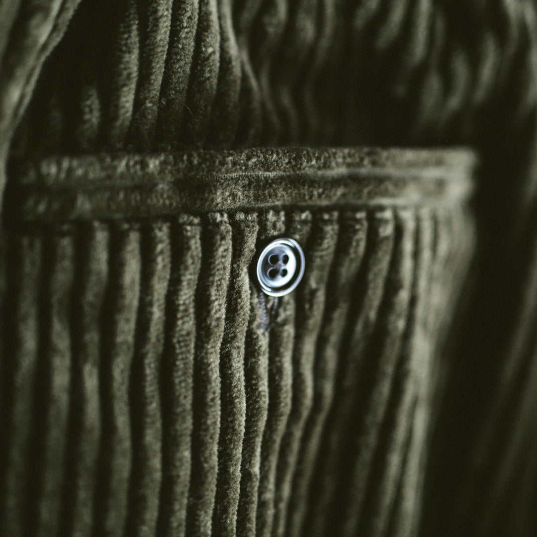 生地にはコットン100%を使用した、太畝の「3.5W コーデュロイ」を採用。一般的な10〜12Wとは一線を画す極太の畝で、その一本一本が際立つことでアイテムとしての確かな存在感を持たせています。