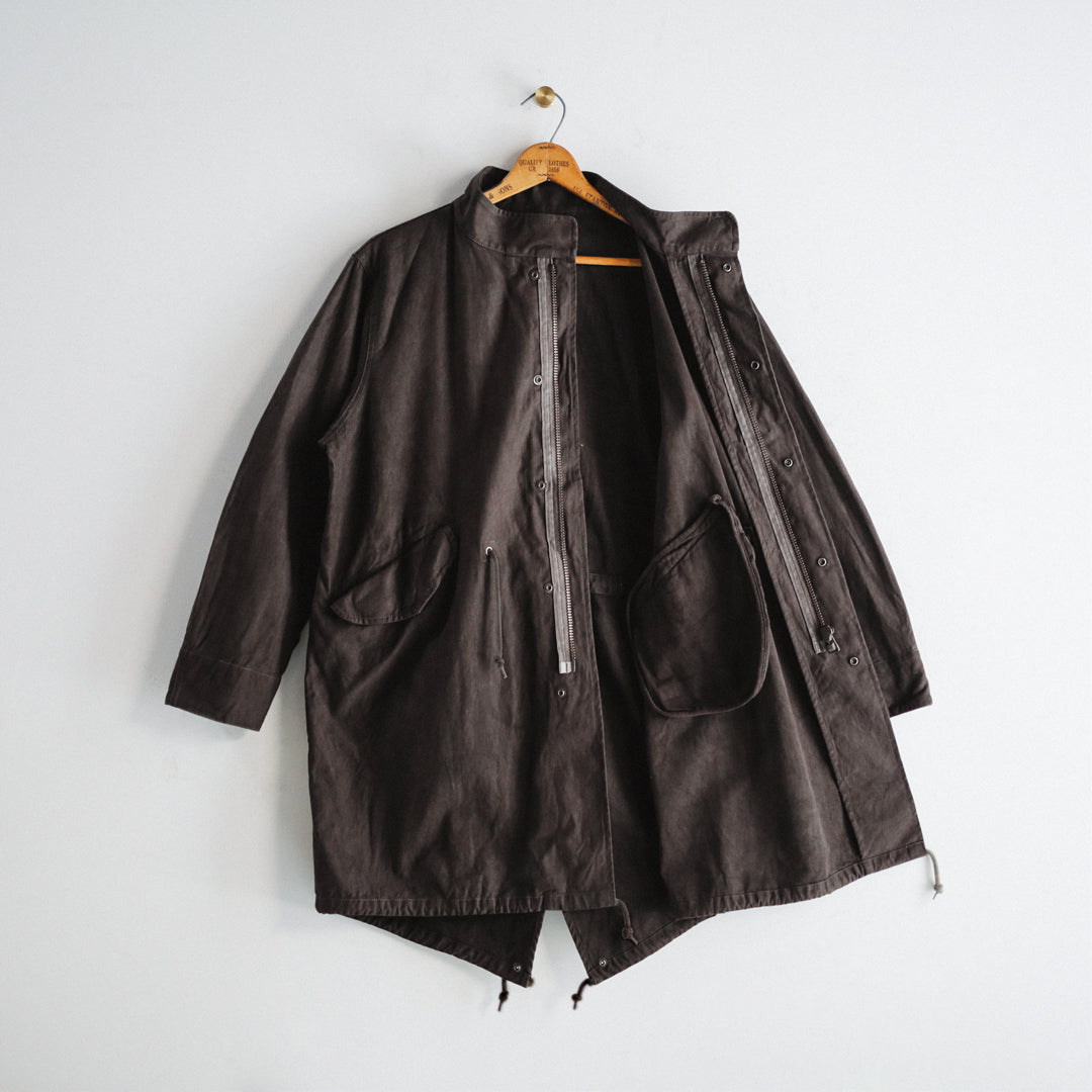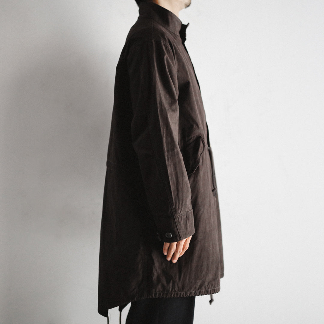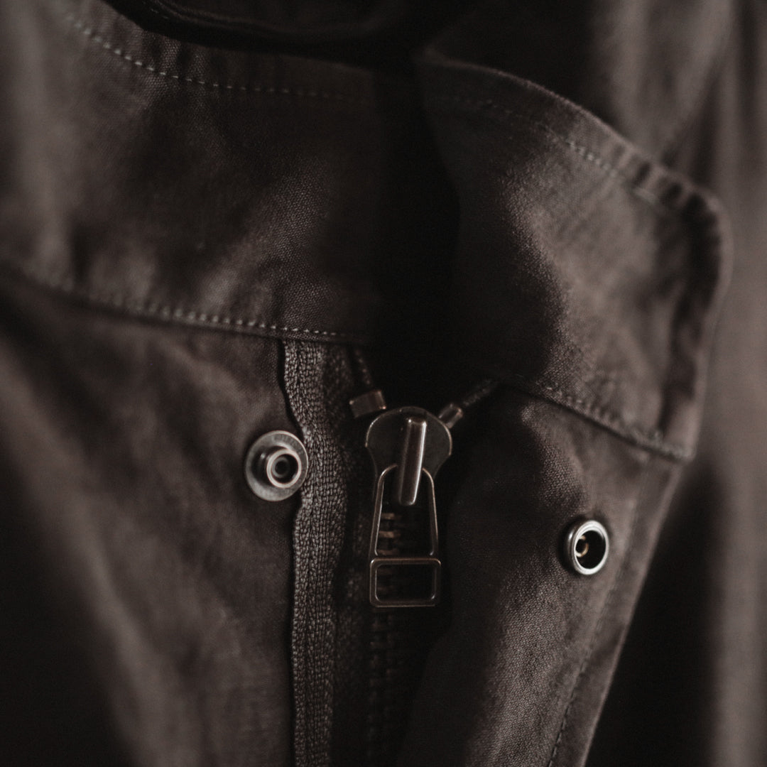 ミリタリーウェアをベースにしたミニマルな意匠に、奄美大島に伝わる泥染めを施すことで、他にはない奥行きを備えた一着に仕上げています。