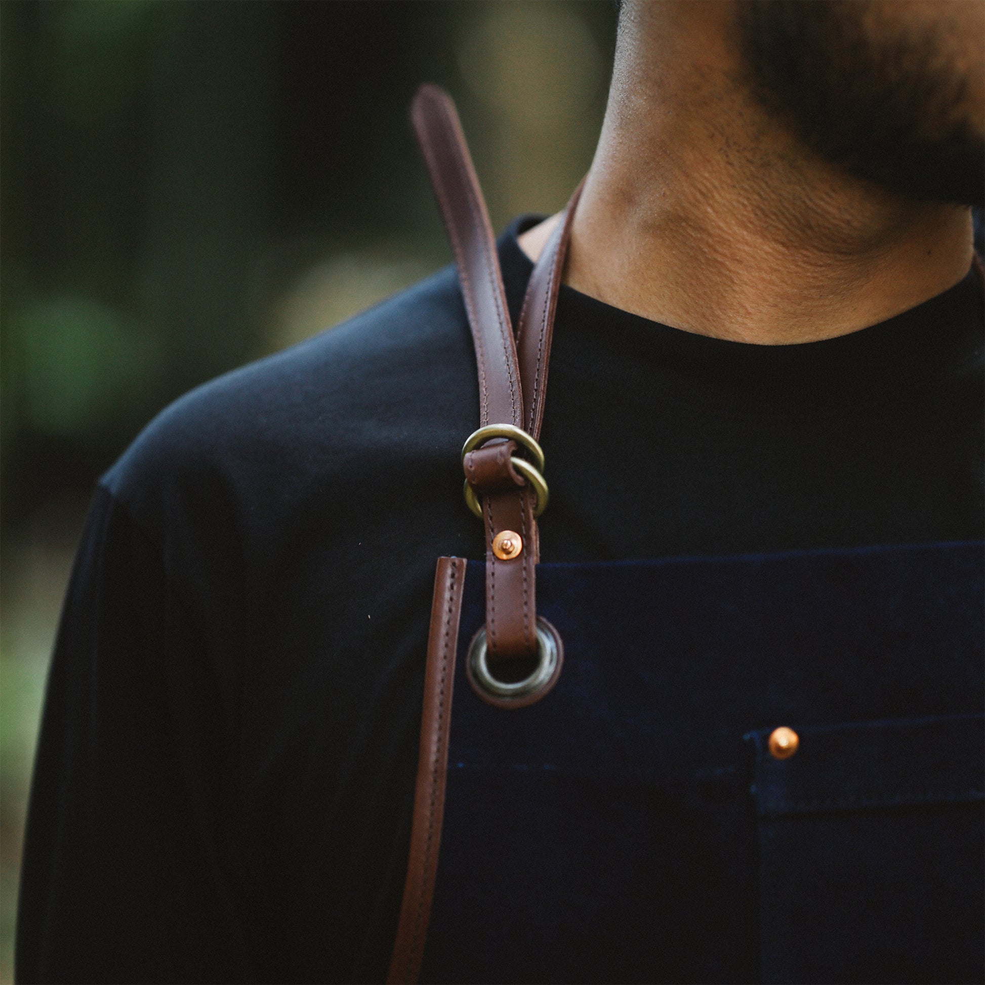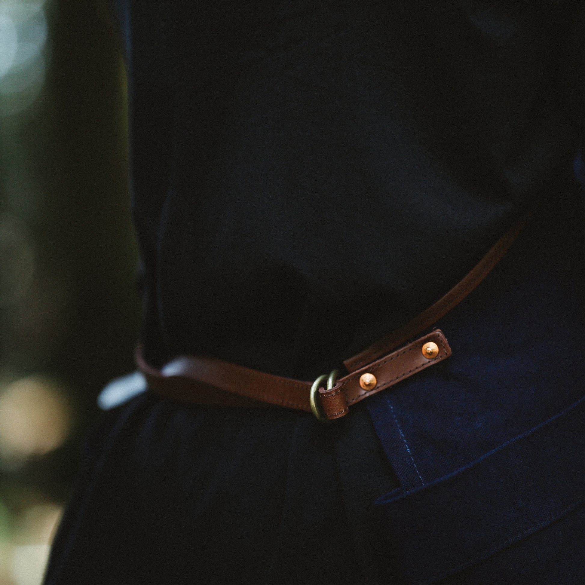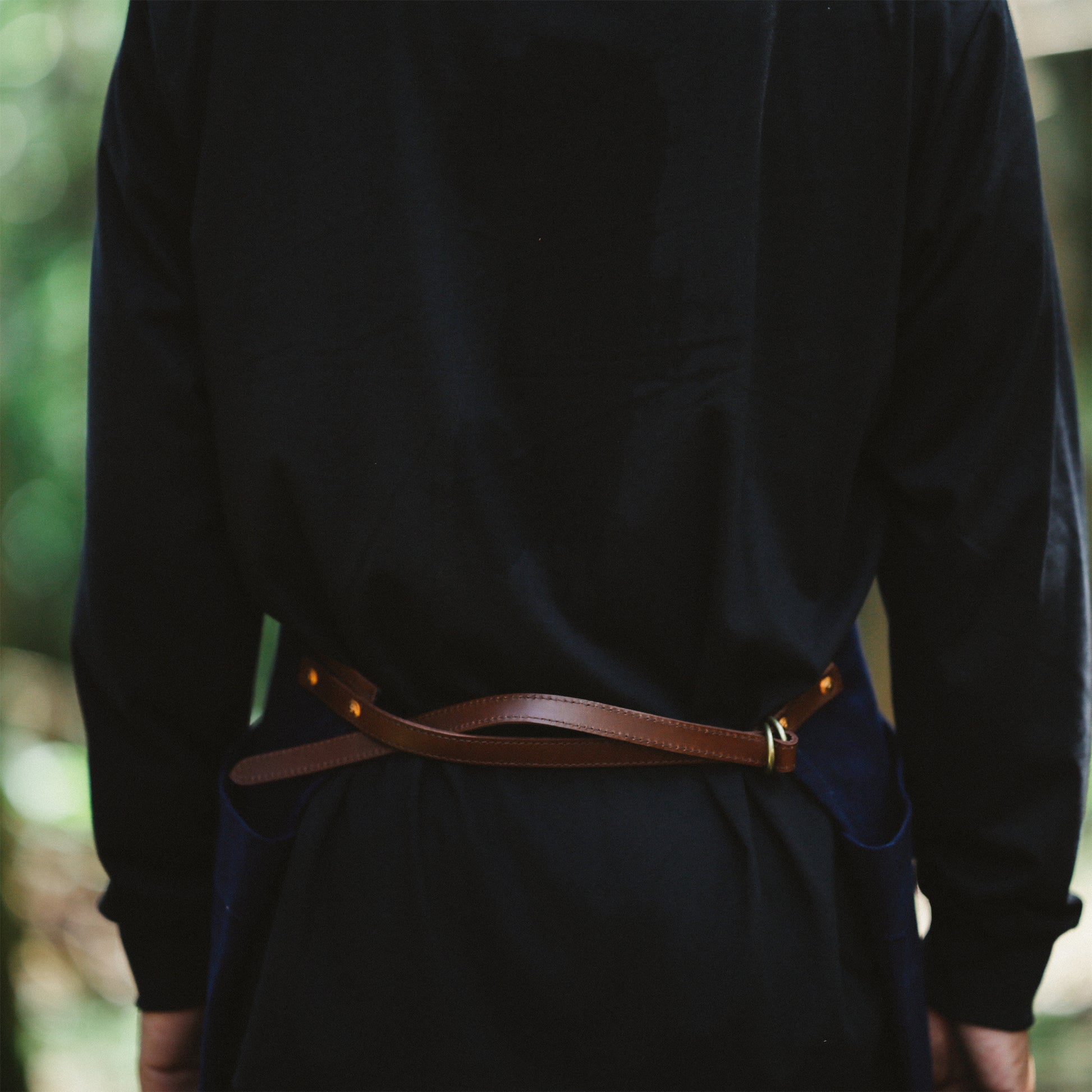今回のエプロンで採用した「経年変化」するマテリアルは、天然染めの帆布だけに留まらず、パーツ類にも採用しています。ベルトや縁などに採用している革は、「牛の本革」。それに、ベルトを通すD型リングは、昔ながらの砂型に流し込んで作る「真鍮」。さらには、生地が切れないように補強のためつけているリベットは、「銅」を採用しています。