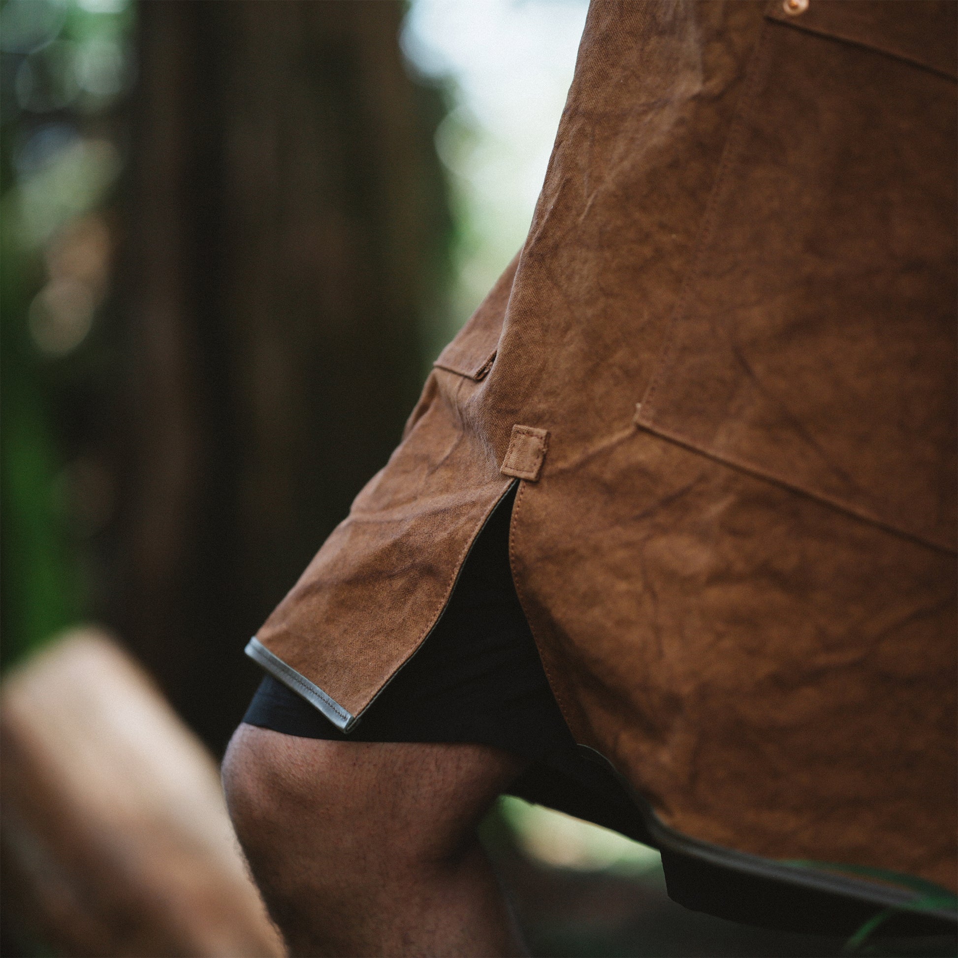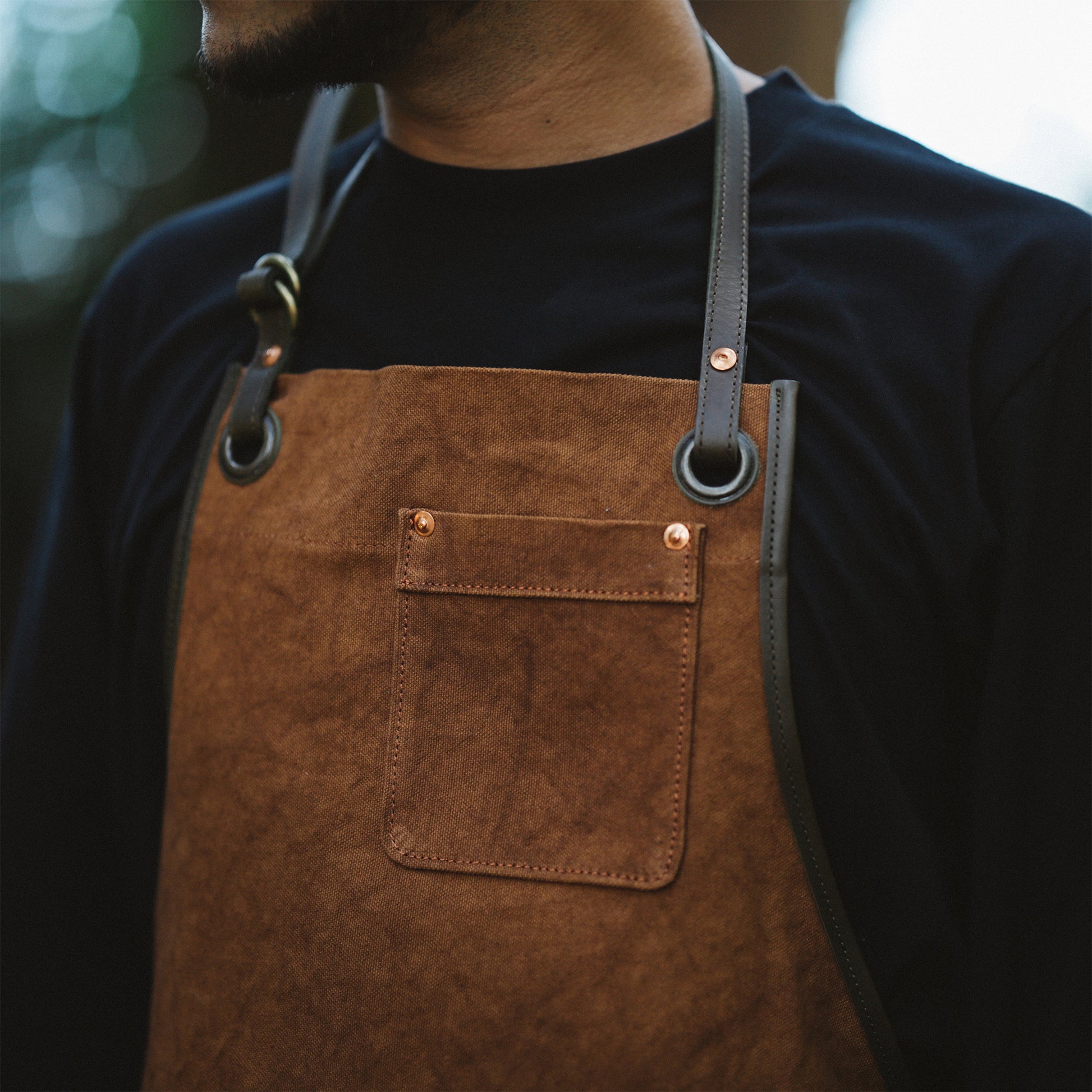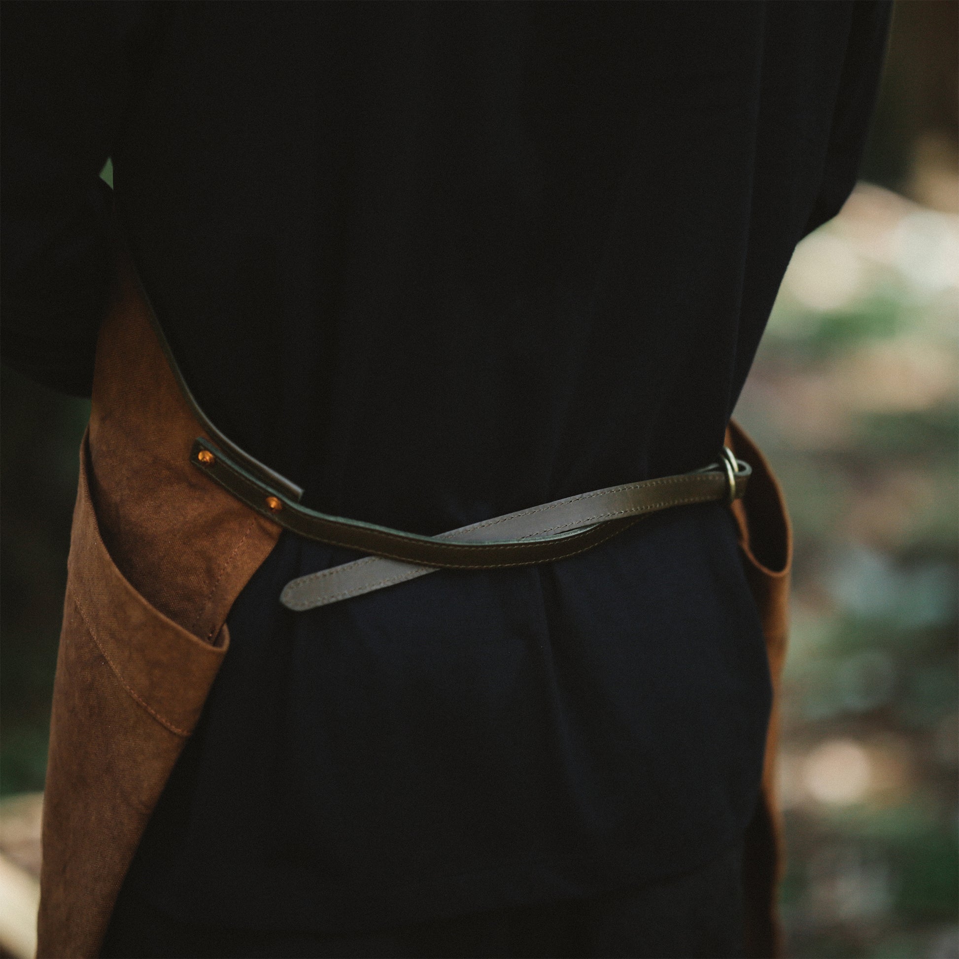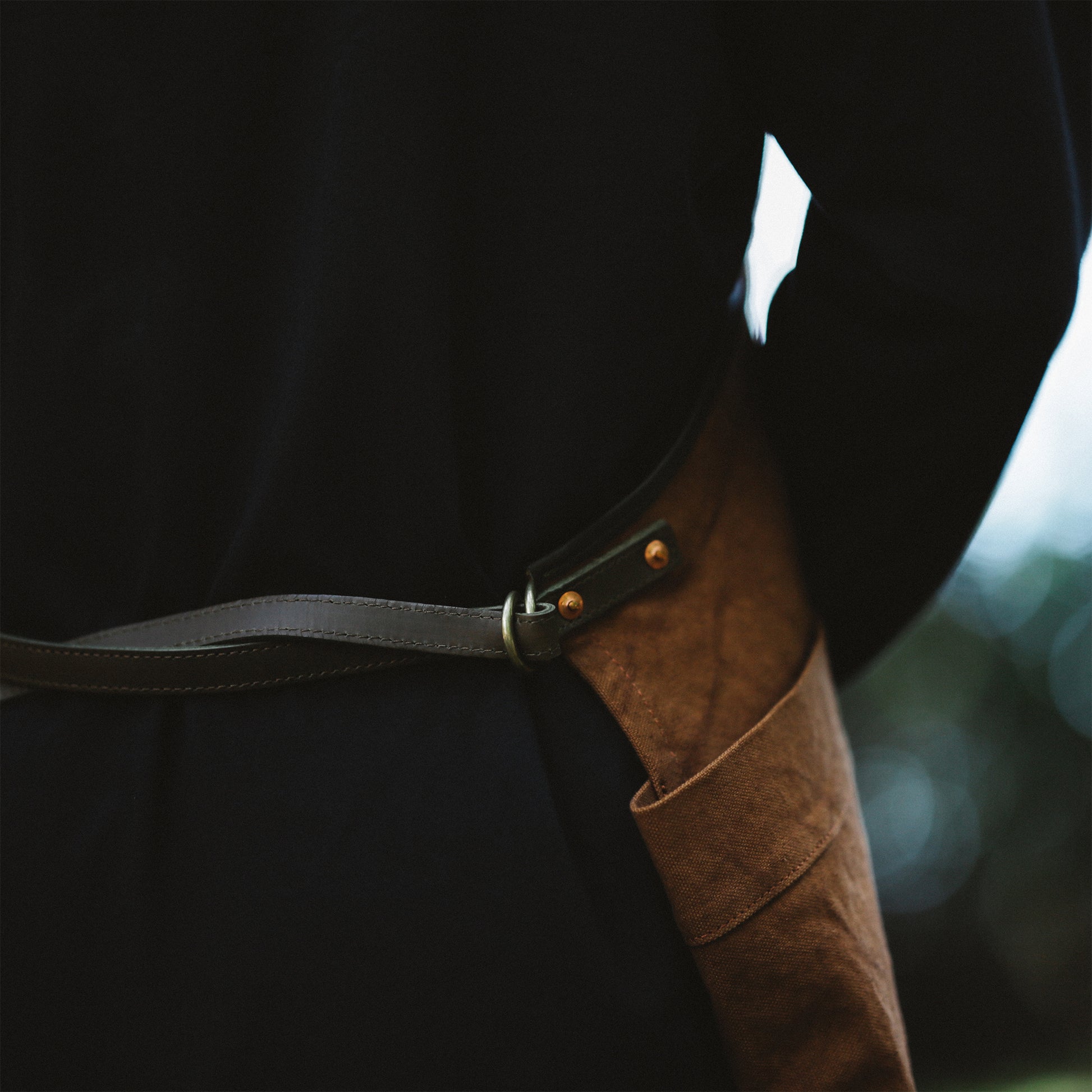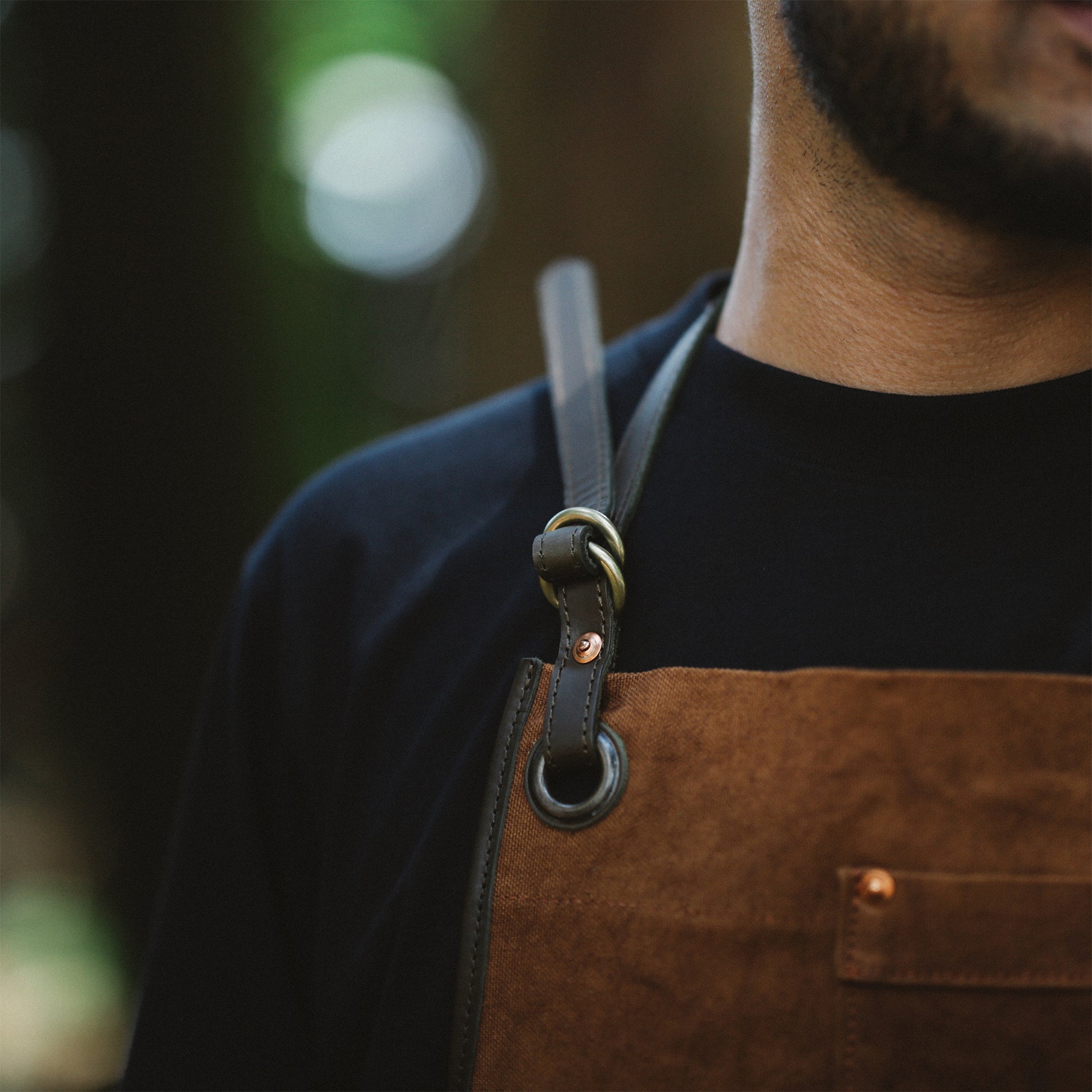 今回のエプロンで採用した「経年変化」するマテリアルは、天然染めの帆布だけに留まらず、パーツ類にも採用しています。ベルトや縁などに採用している革は、「牛の本革」。それに、ベルトを通すD型リングは、昔ながらの砂型に流し込んで作る「真鍮」。さらには、生地が切れないように補強のためつけているリベットは、「銅」を採用しています。