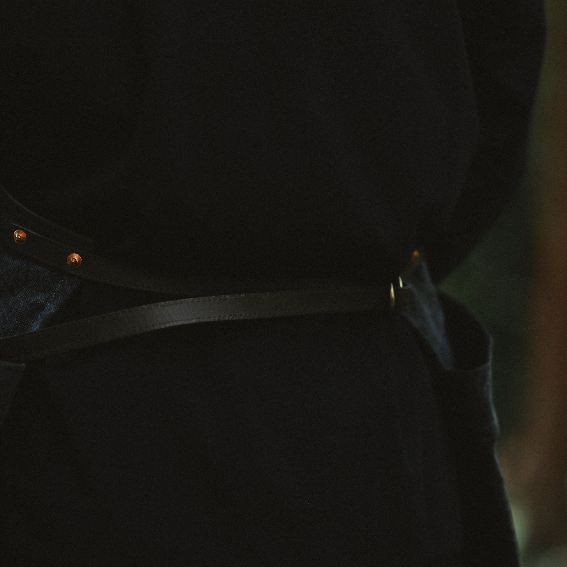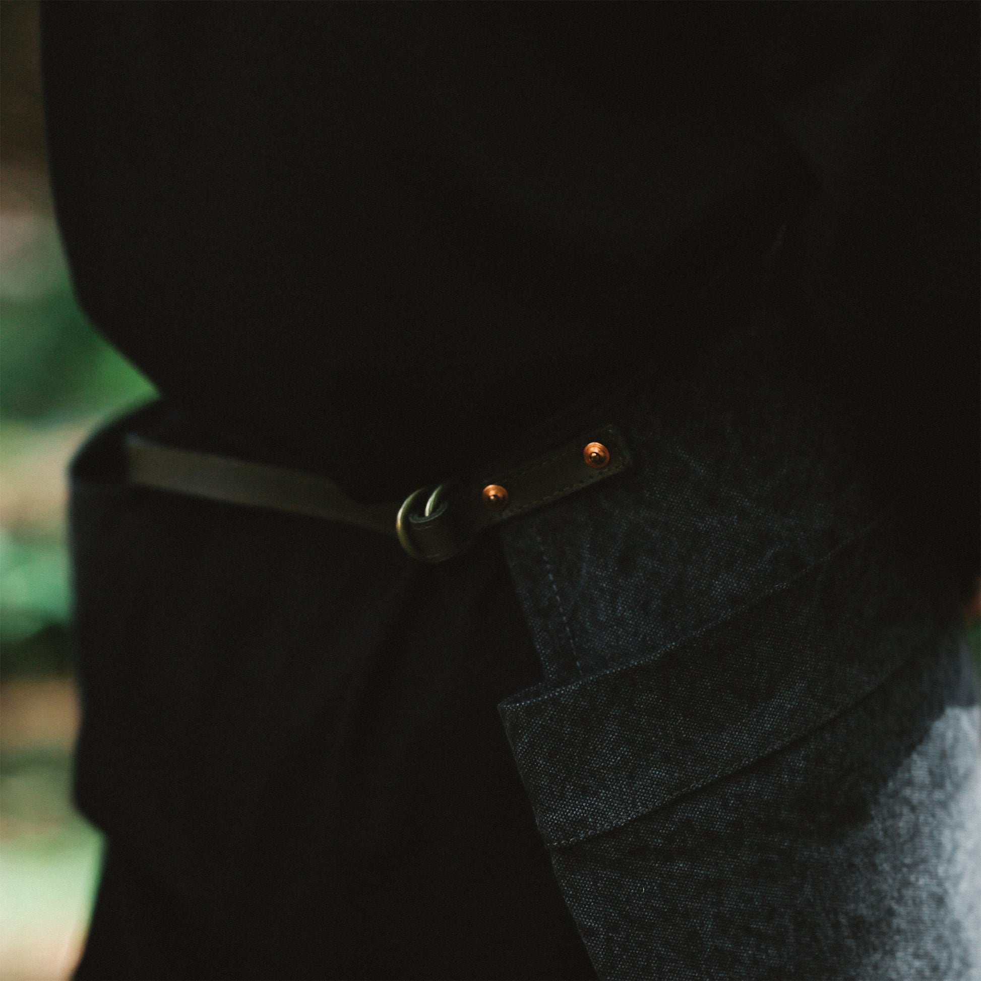 今回のエプロンで採用した「経年変化」するマテリアルは、天然染めの帆布だけに留まらず、パーツ類にも採用しています。ベルトや縁などに採用している革は、「牛の本革」。それに、ベルトを通すD型リングは、昔ながらの砂型に流し込んで作る「真鍮」。さらには、生地が切れないように補強のためつけているリベットは、「銅」を採用しています。
