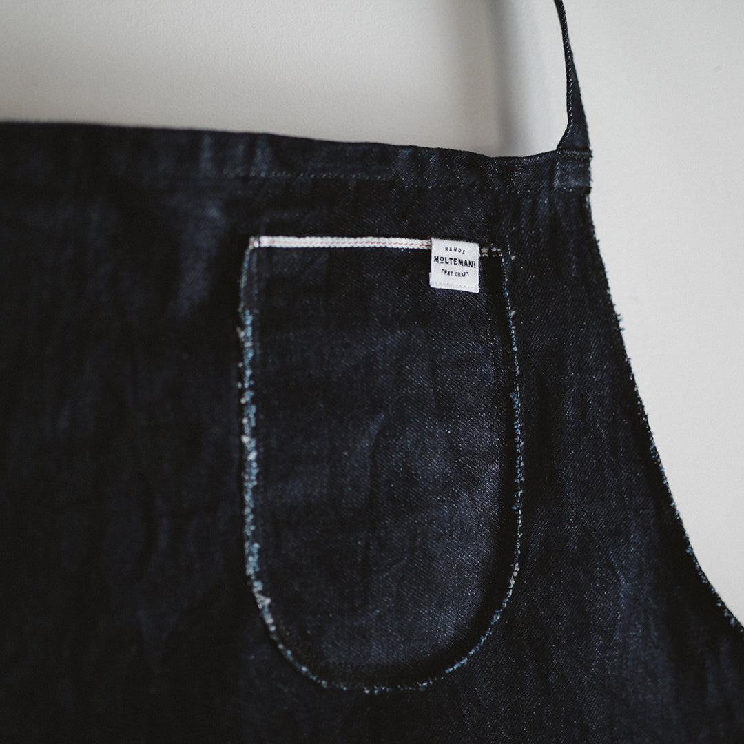 日頃から古いものを蒐集している中で、ひときわ惹かれたものがこちらのデニムエプロン。年代は不明ですが、デザインや形状、色落ちやアタリの風合いなど、そのディテールや経年具合からは、半世紀は遡るものではないかと想像します。エプロンはMOLTEMANI(モルテマニ)にとって、思い入れのあるアイテムです。2021年にブランドを立ち上げた最初のアイテムラインナップにも、エプロンを入れていました。それは、日々の営みの中で使い込むほどに風合いが増していき、使った人の時間と痕跡が反映され、その人にしか出せない味わい深いものへと変化していくもの。長く使い続けるうちに、愛着という想いが湧き上がってくるもの。そんな考えに相応しいと思ったアイテムがエプロンでした。