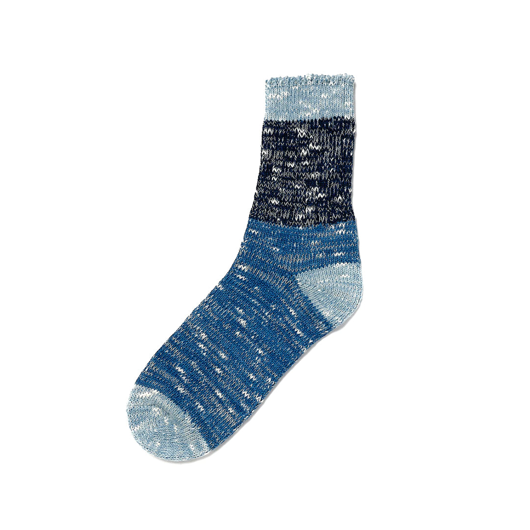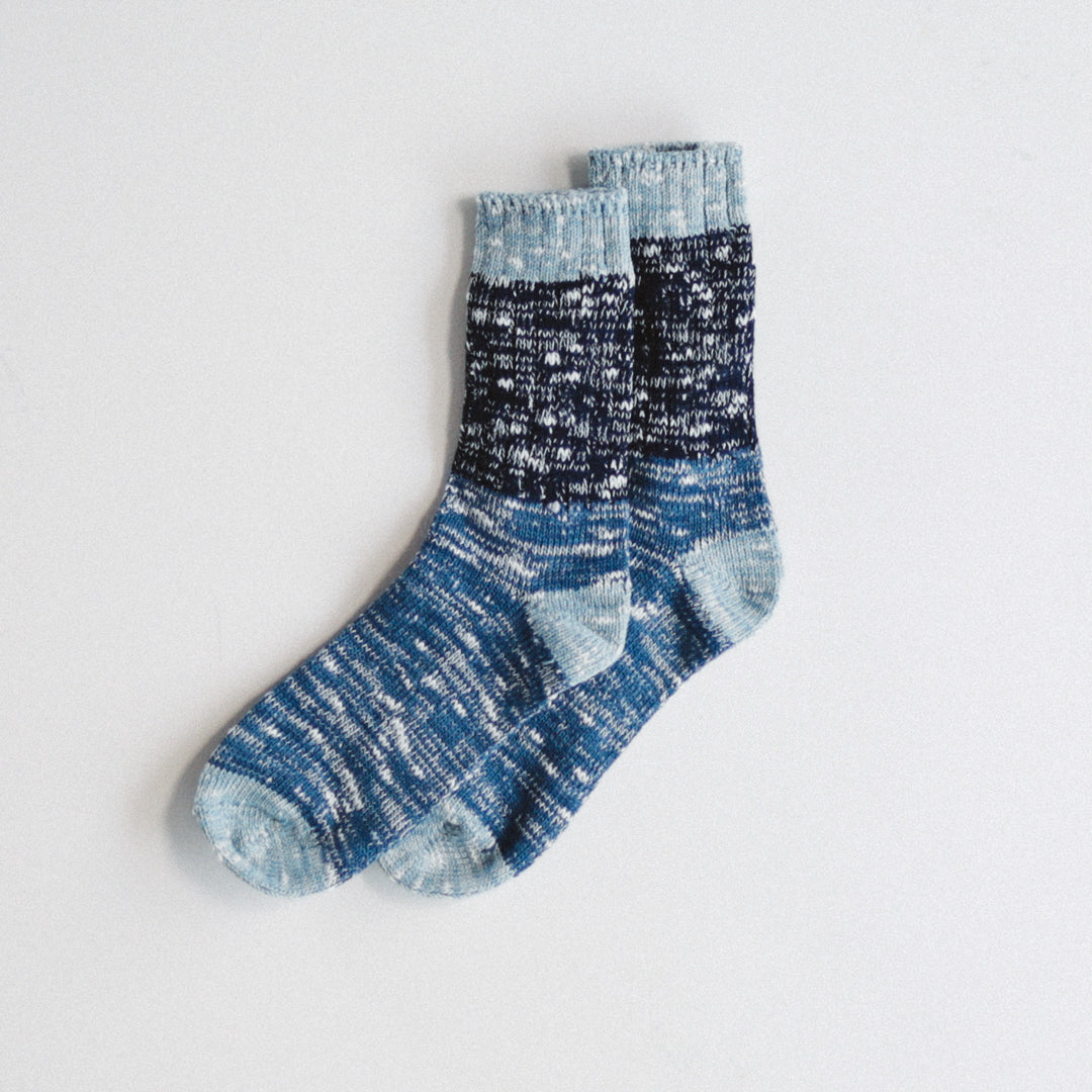 日本には古くから藍四十八色という言葉があります。この一足は藍染の糸を9 色に染め分け、スラブ糸とよばれる不規則に節の入った白色の糸と、共に編み立てることで、より藍が引き立ち、表情豊かな靴下に仕上がりました。