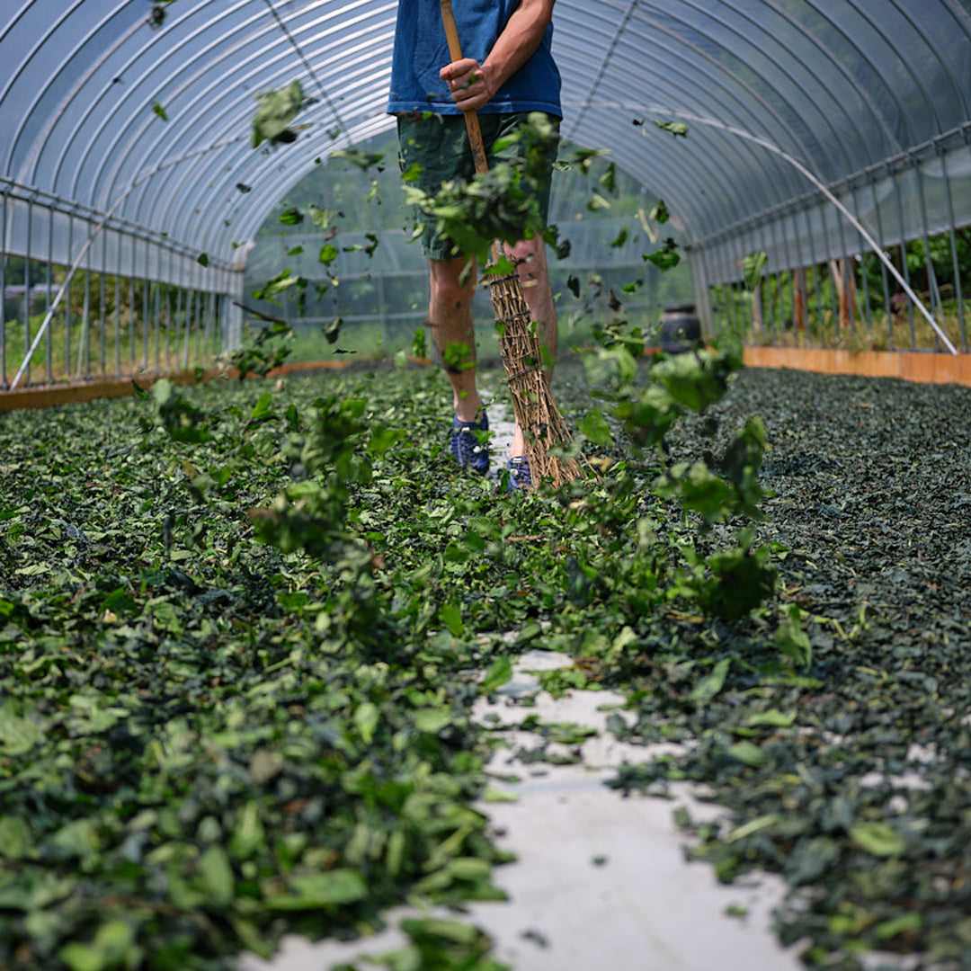 「本藍染め」は、一粒の種を育てることから始まります。ケミカル染料(化学染料)とは違い、天然の染料になるので簡単に作れるものではなく、時間と根気が必要となります。いわゆる農家さんの作業となるわけです。春の大安の日に種植えを行い、夏まで育てた苗を、秋に収穫し、冬に宿毛(すくも)と言われる「本藍染め」に必要となる原料ができあがります。