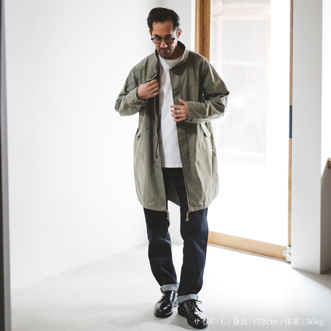 ミリタリーウェアをベースに、装飾を抑えた現代的な佇まいに仕上げた「8.5oz Okayama Back Satin Mods Coat」。