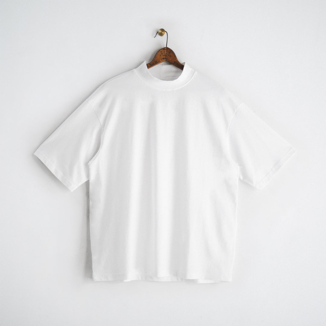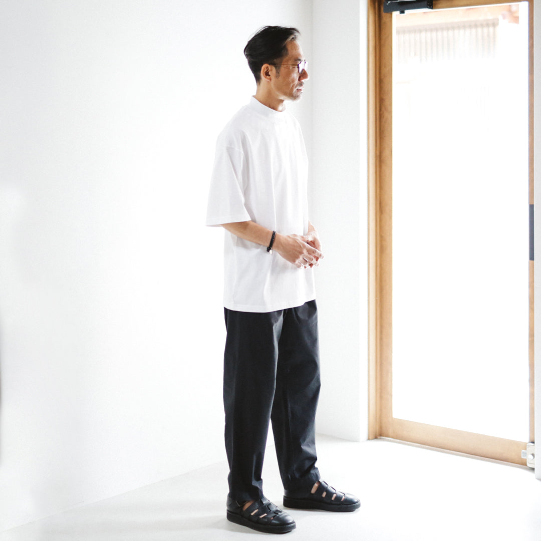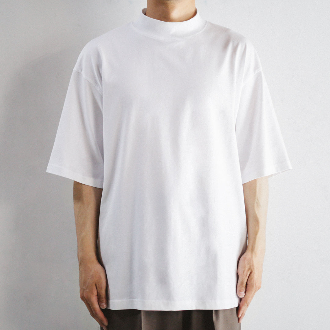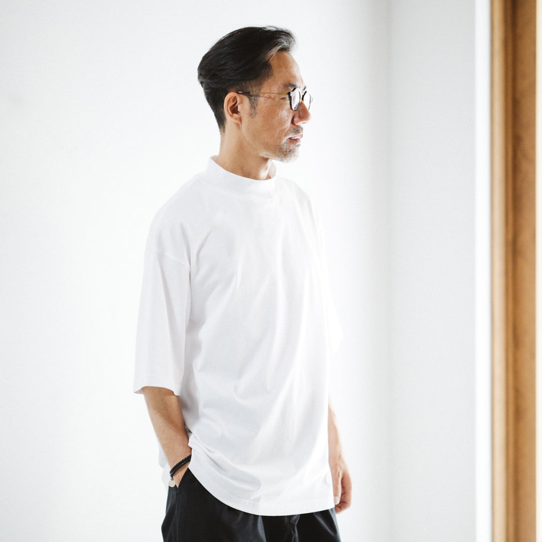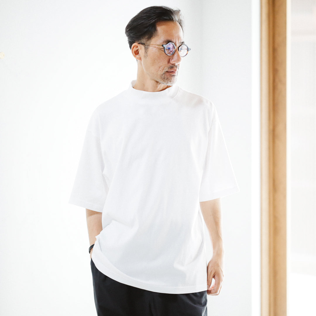 ゆとりあるシルエットと、品のあるデザインに仕上げた「7.7oz Over Size Mock Neck T-shirt」。