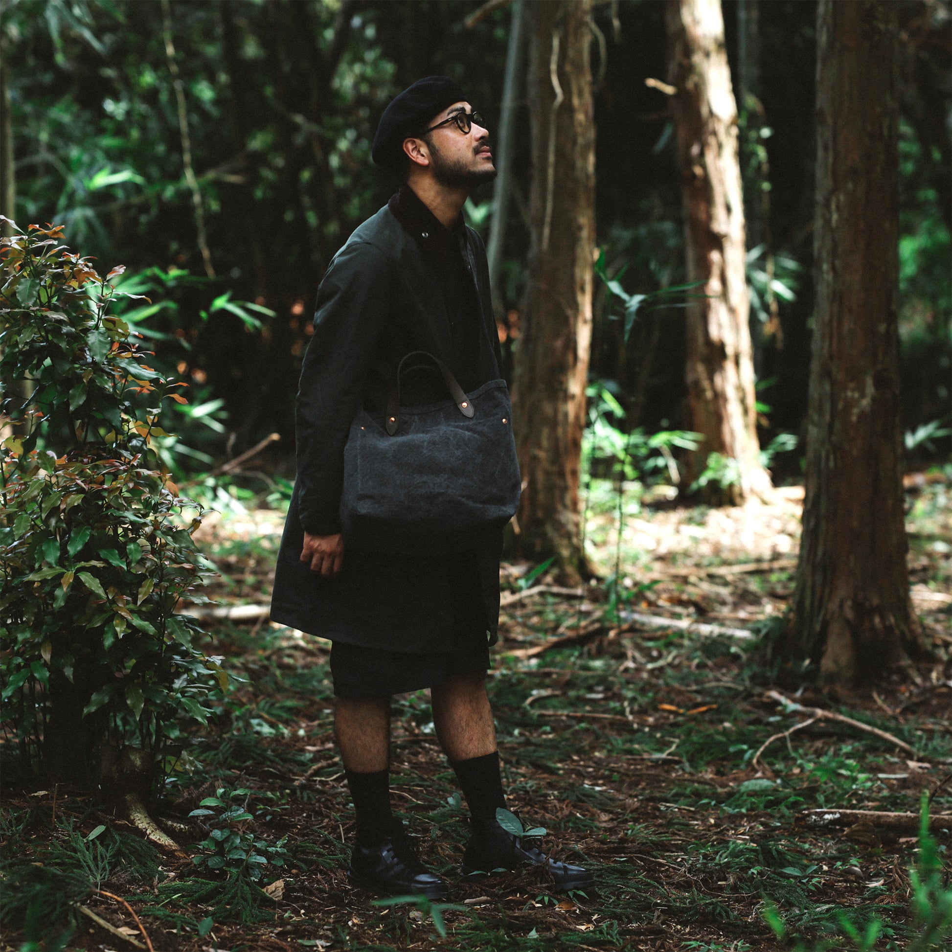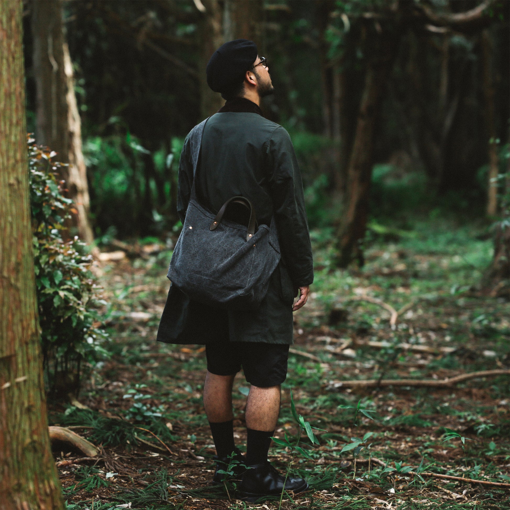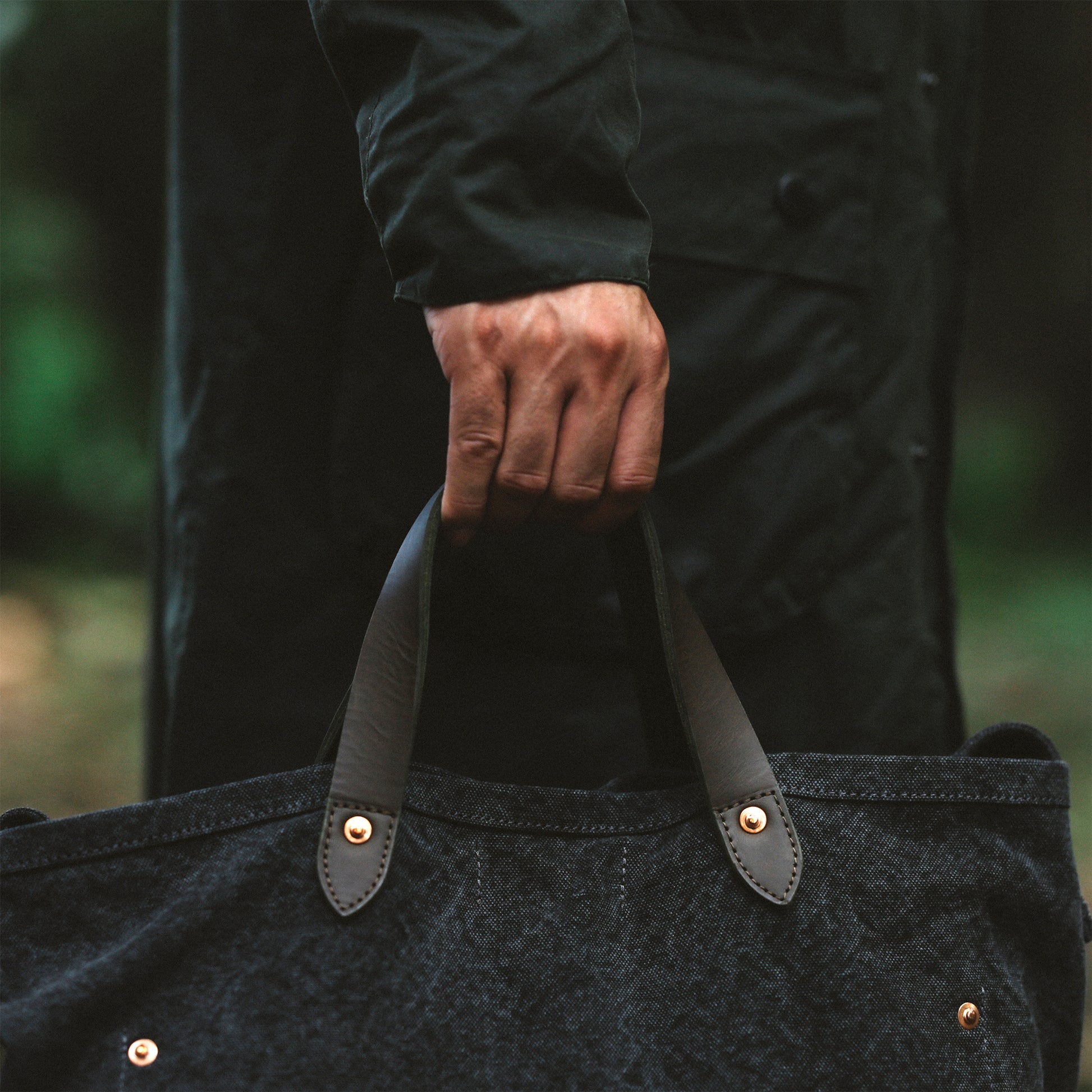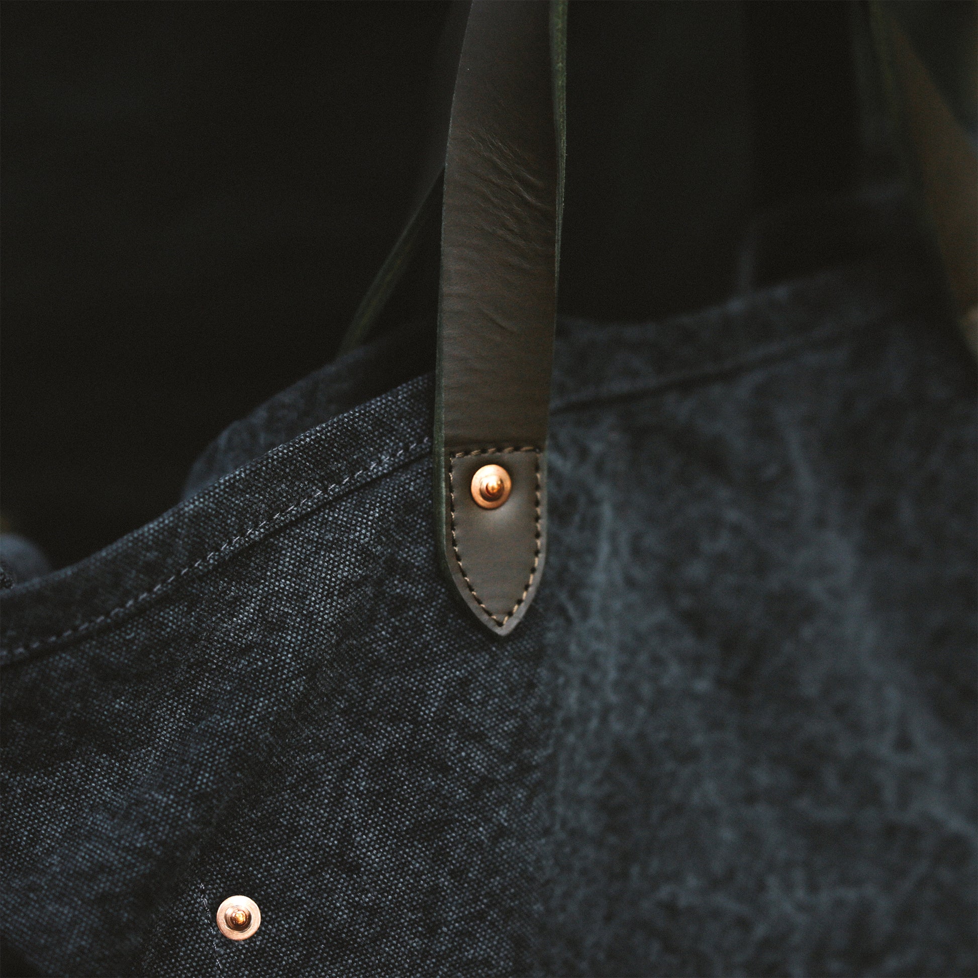 材質:生地:倉敷帆布(天然染め / 紀州備長炭) / ハンドル:牛革 / パーツ:銅