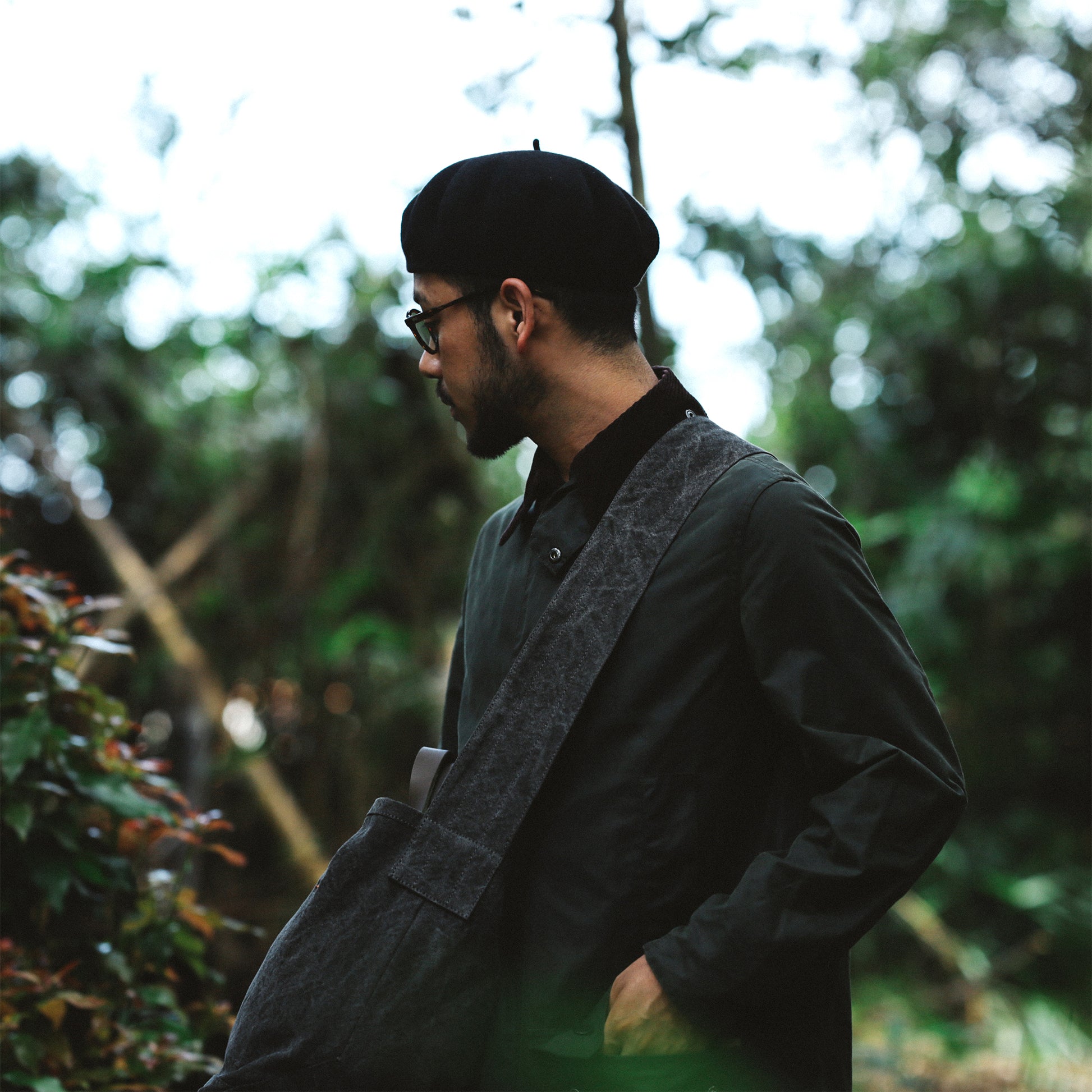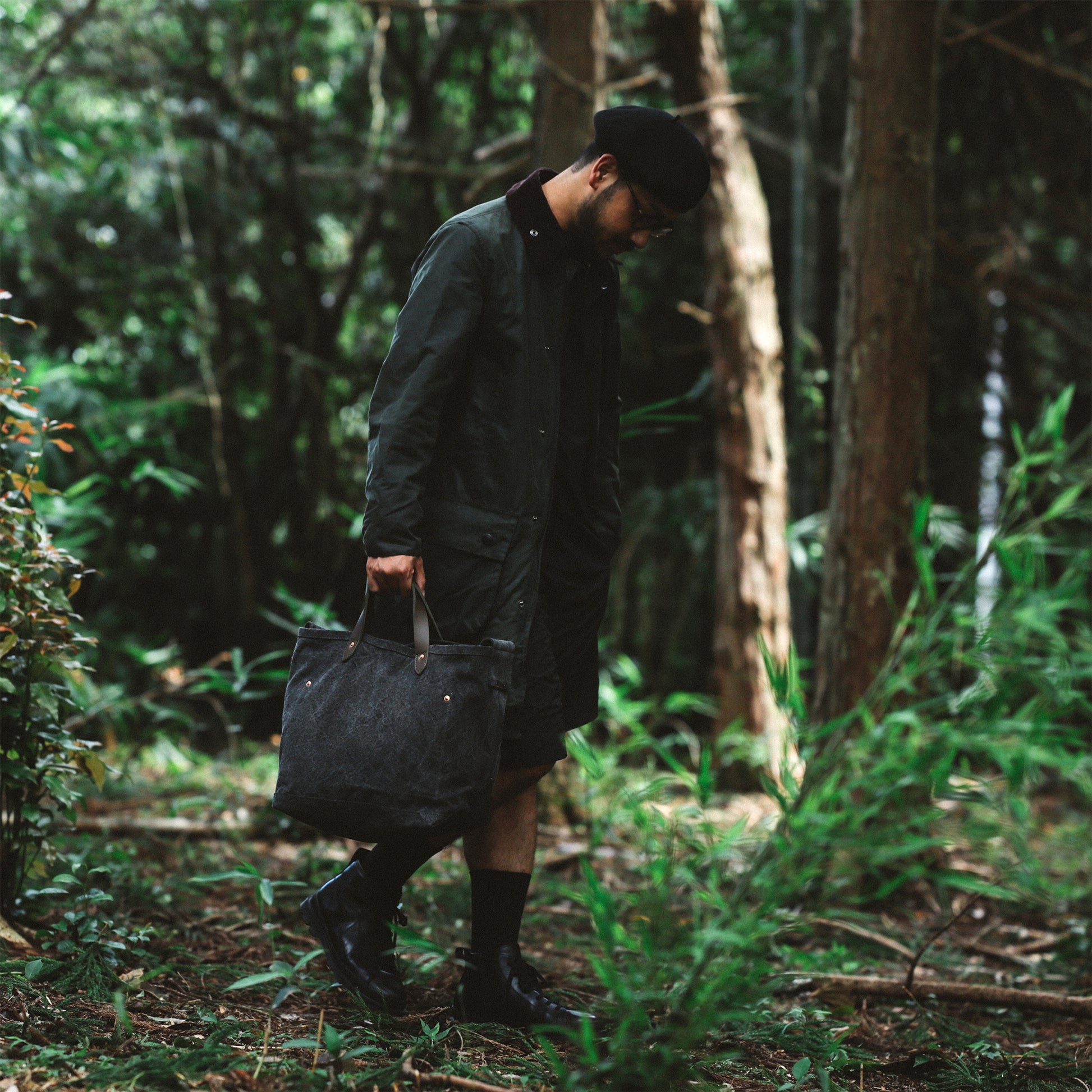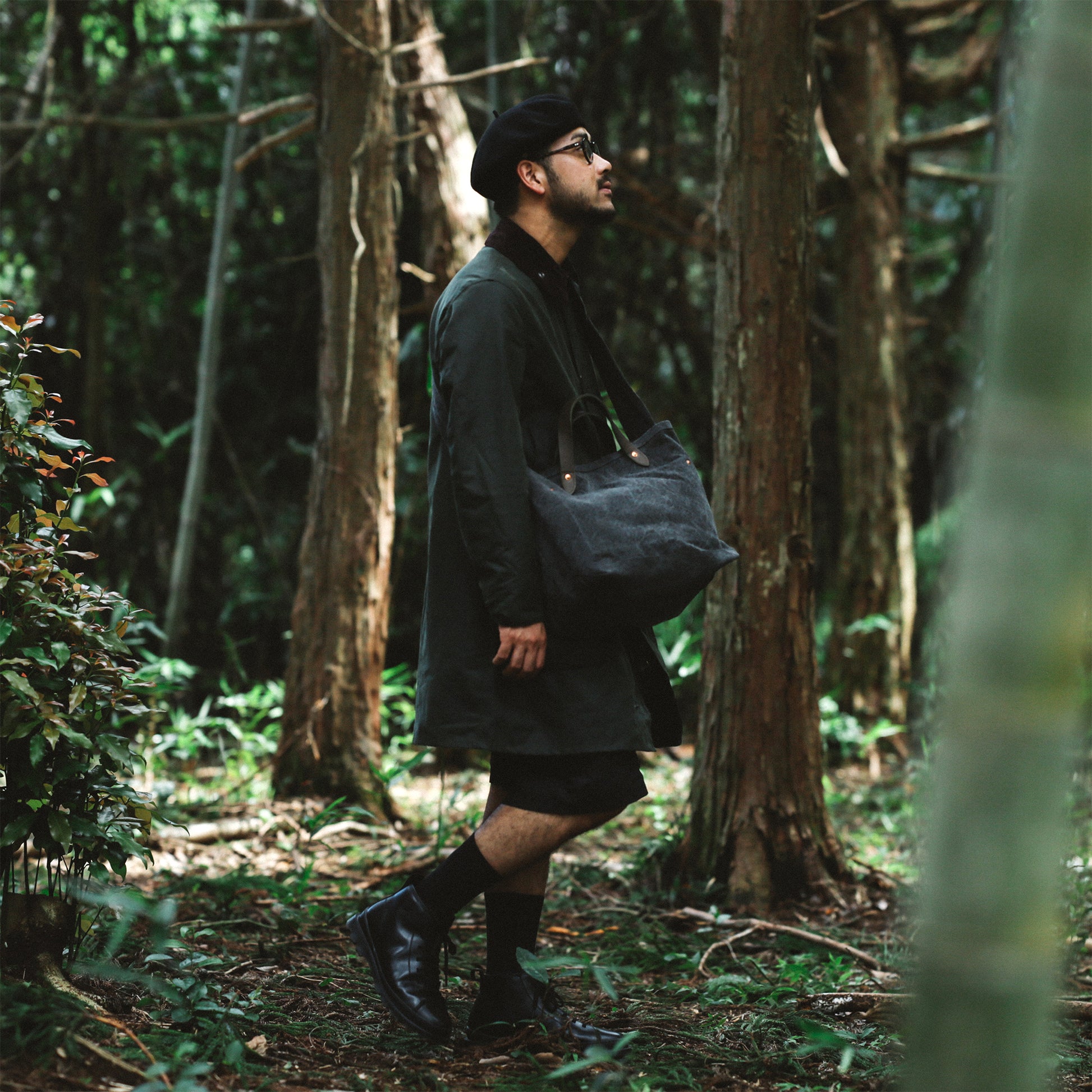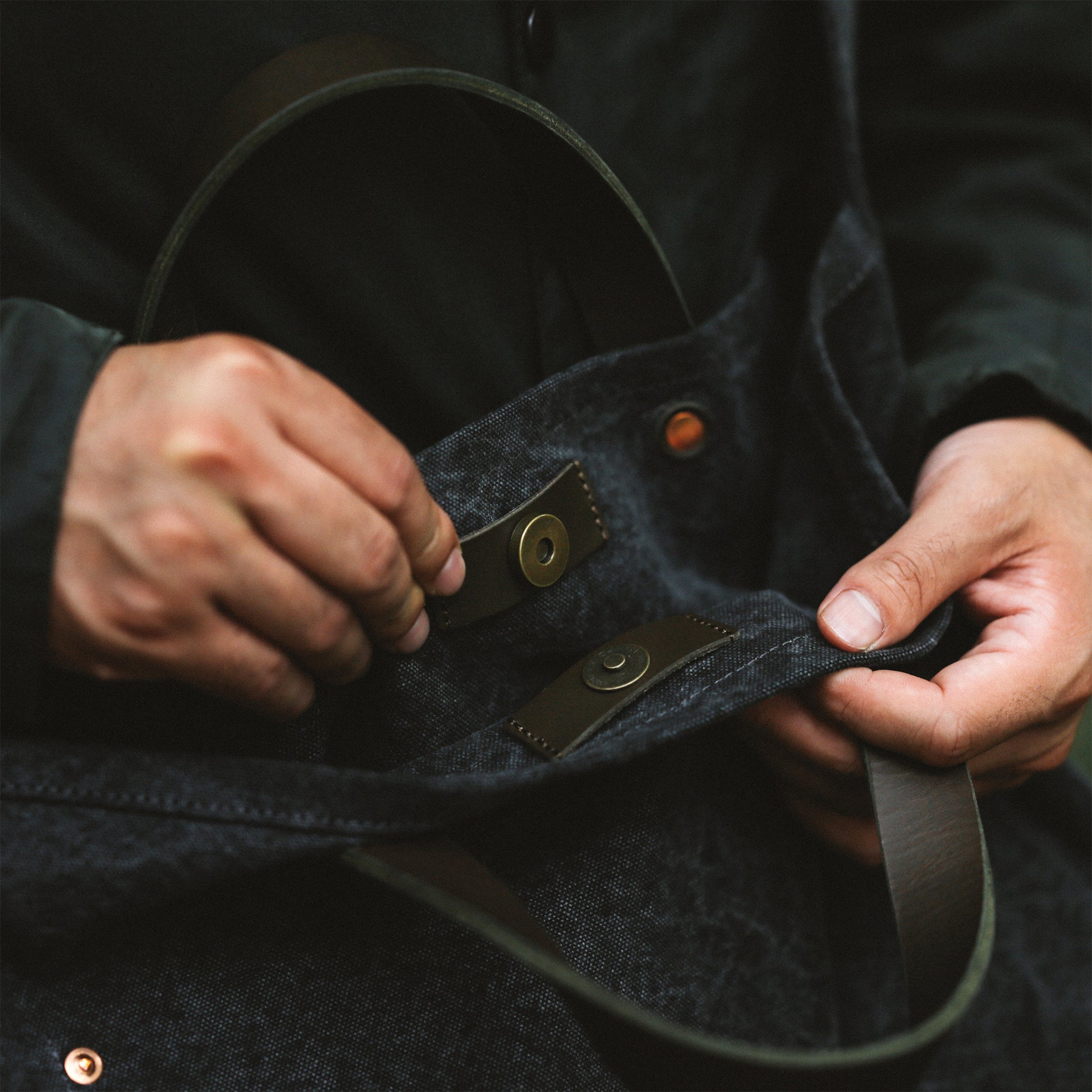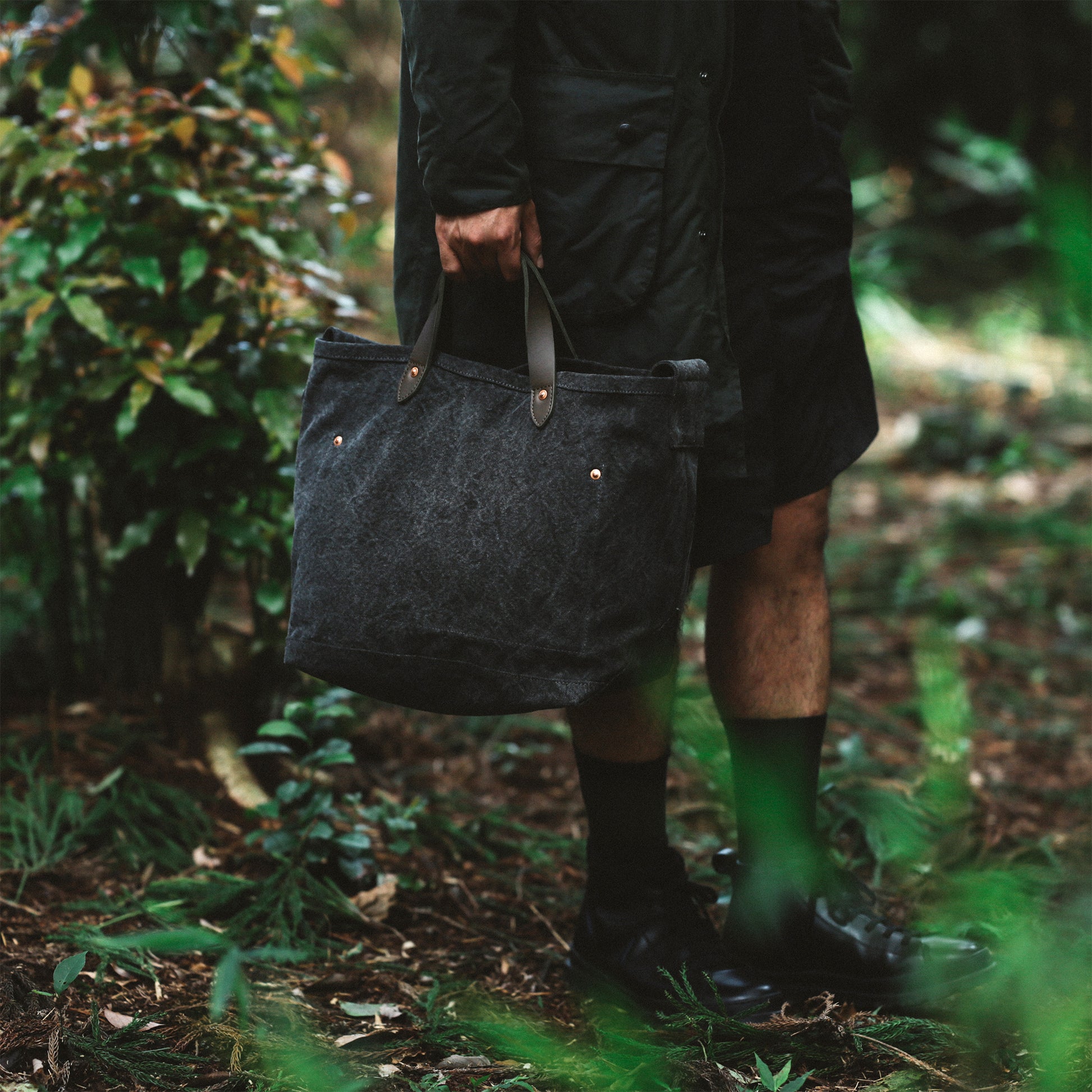 材質:生地:倉敷帆布(天然染め / 紀州備長炭) / ハンドル:牛革 / パーツ:銅
