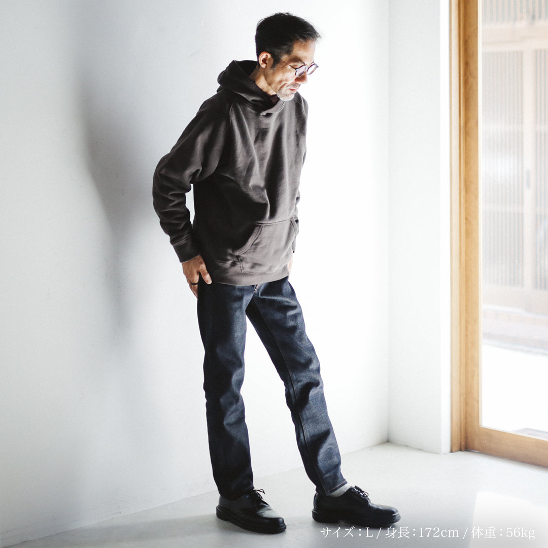 12oz Wakayama " Tsuri-Ami " Hoodieは、着用時のシルエットや動きを考慮しながら、細部にわたって丁寧に縫製されています。品の良い印象を残しながらも、履いたときに自然とリラックス感が生まれるそのシルエットを忠実に再現可能なのは、前後の工程まで見通した上での縫製技術と蓄えられた経験があるからこそです。